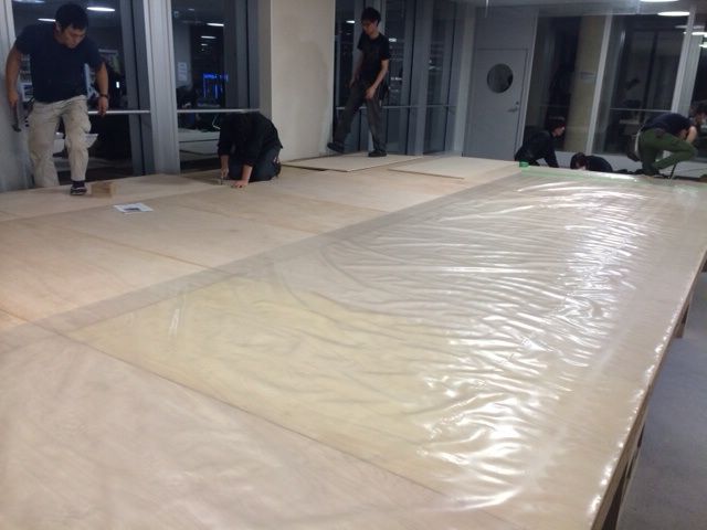 今度は表面に透明なビニールシートを舞台前より貼って行きます。