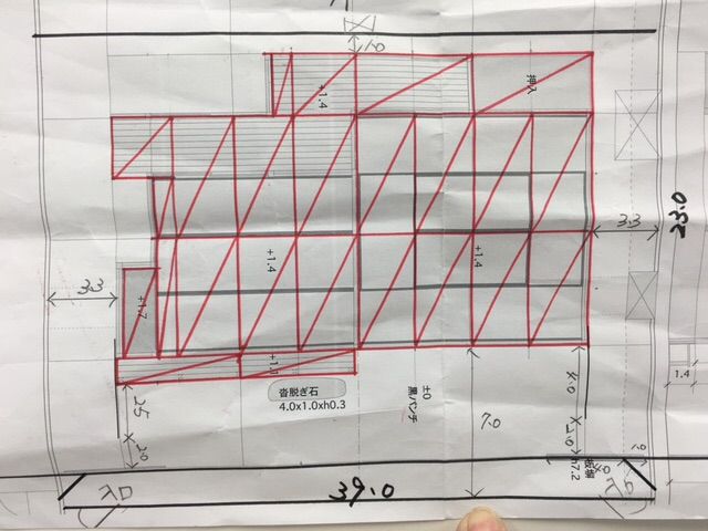 土台組み(二重組み)は強度を考えて、箱足を縦、横と違い違いに置いた上に平台を置きます。