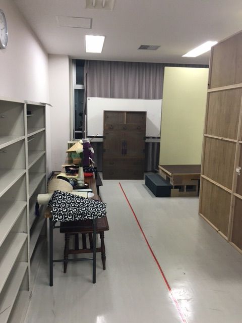 稽古場の中はセットでいっぱいですが、小道具置き場もセッティングしてあります。