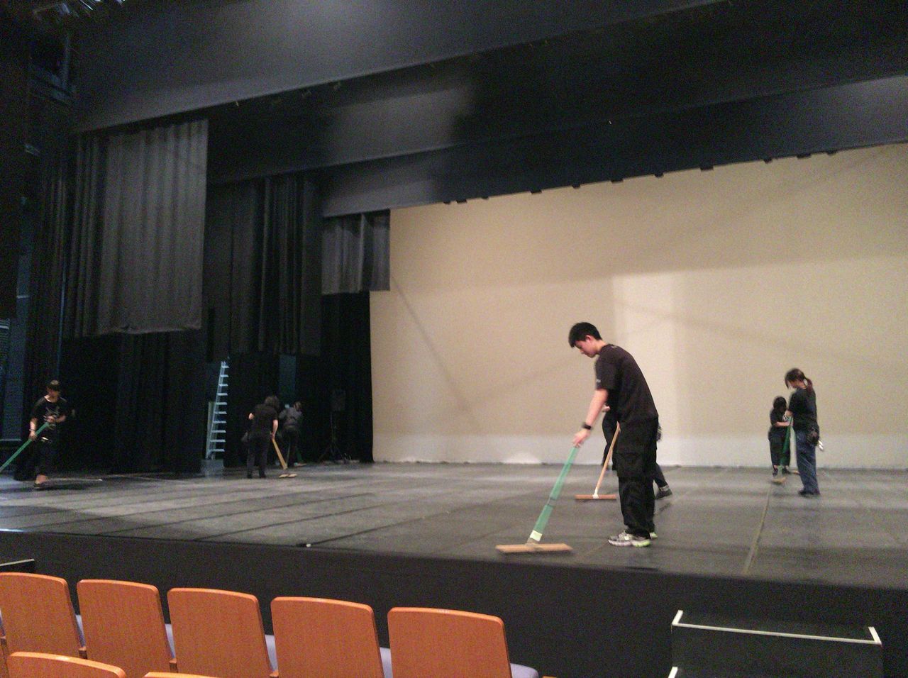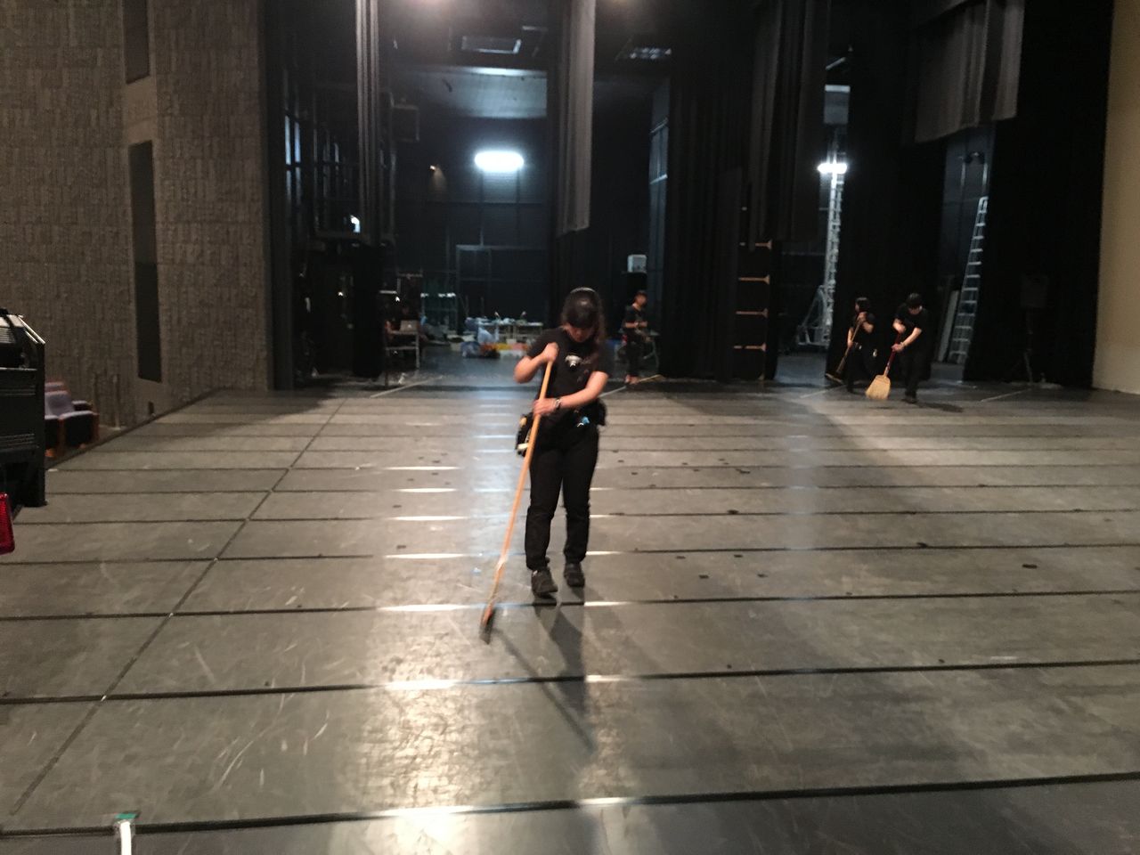 朝劇場に入り先ず演出部チームは、舞台上の掃除とチェックです。