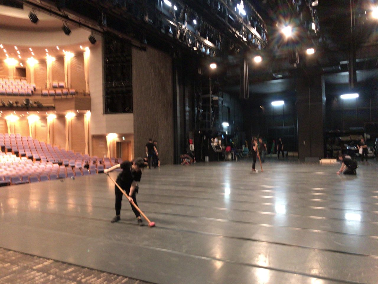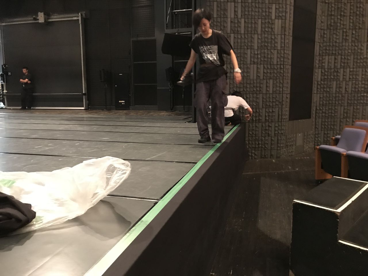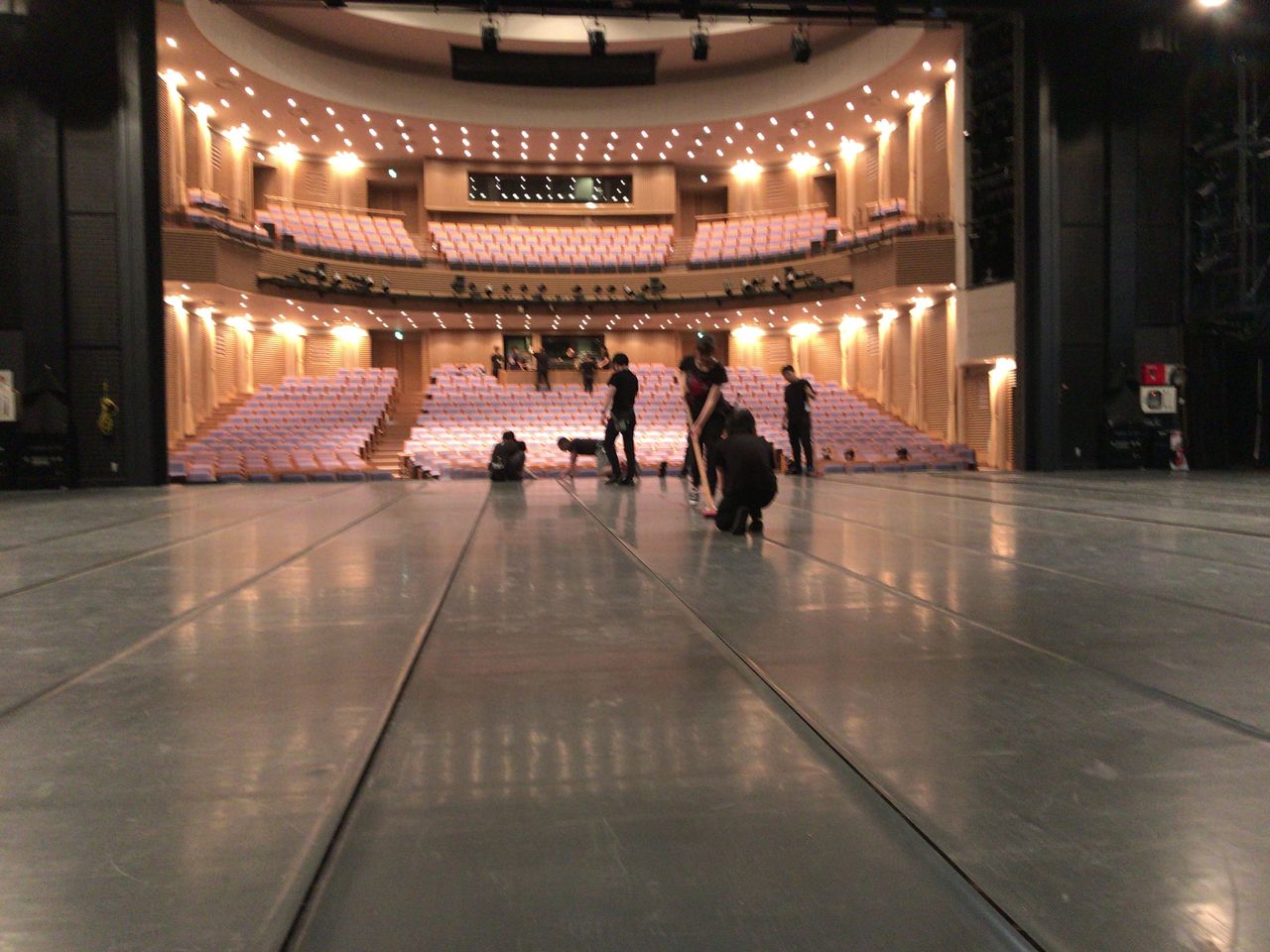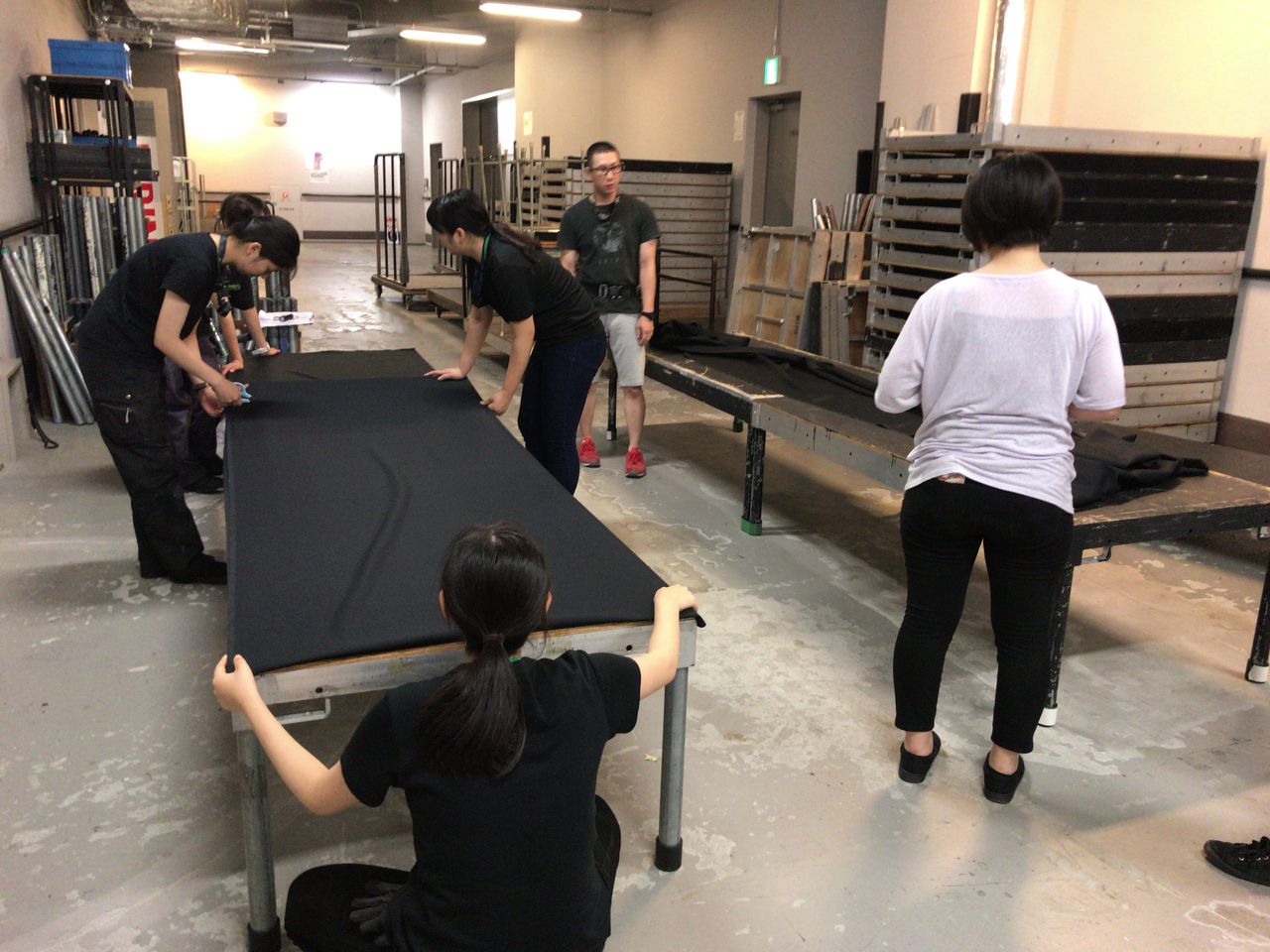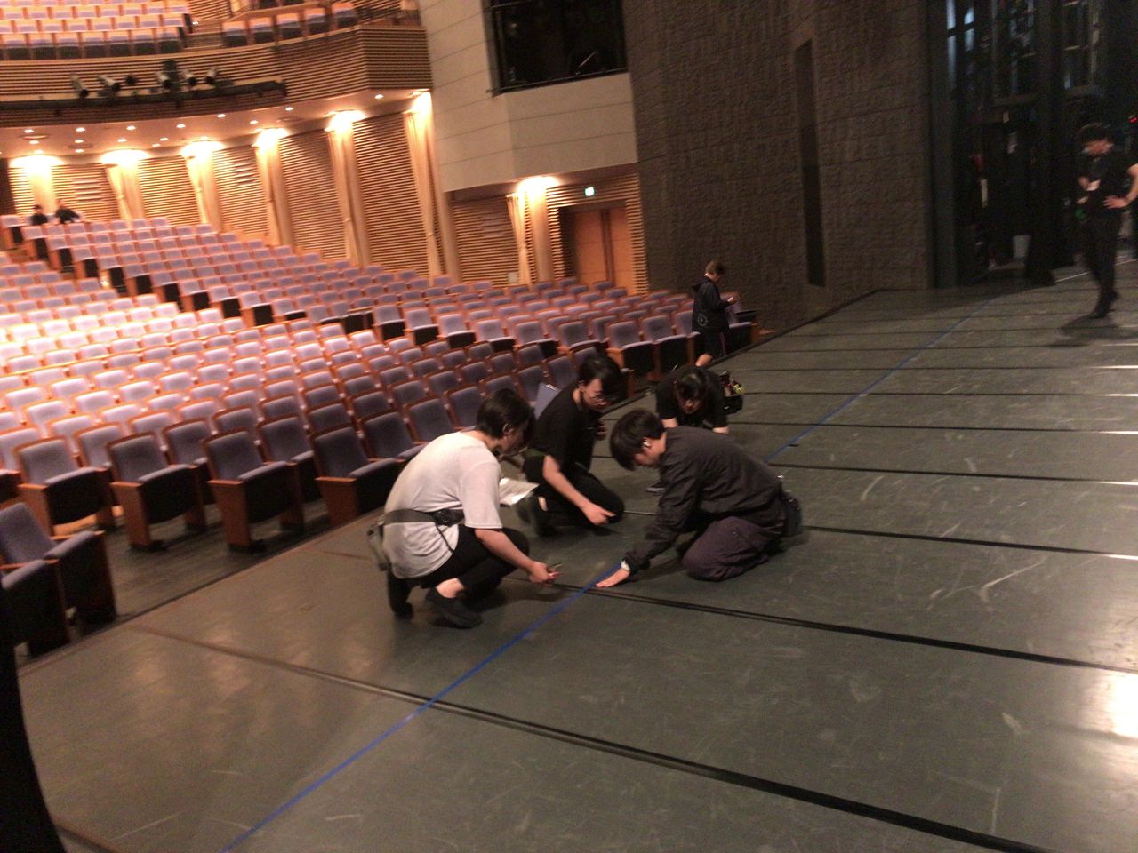 照明バトンが上がったら、演出部は床面に平板マットを舞台センターより貼ります。