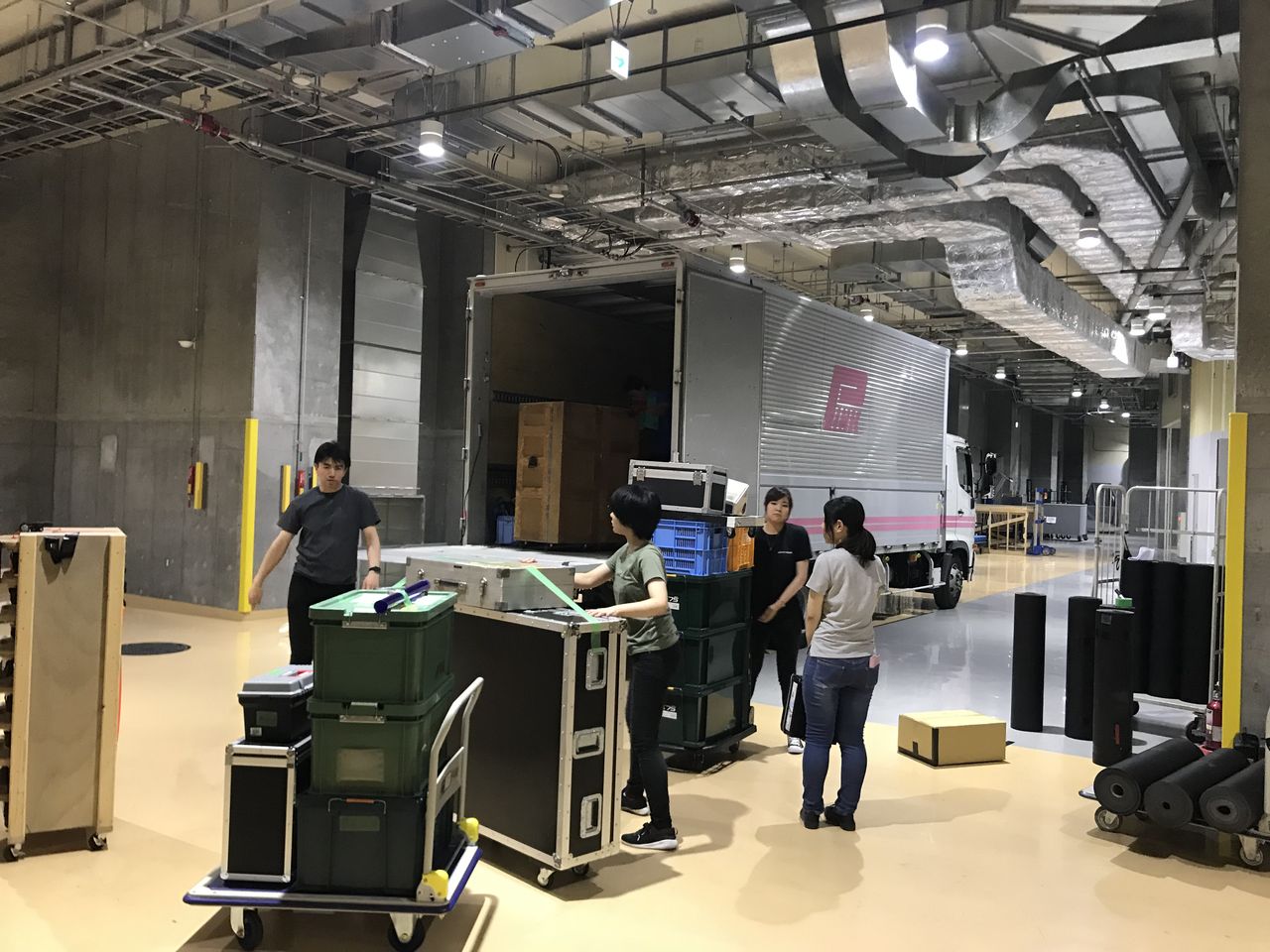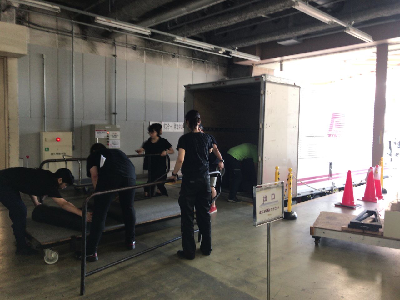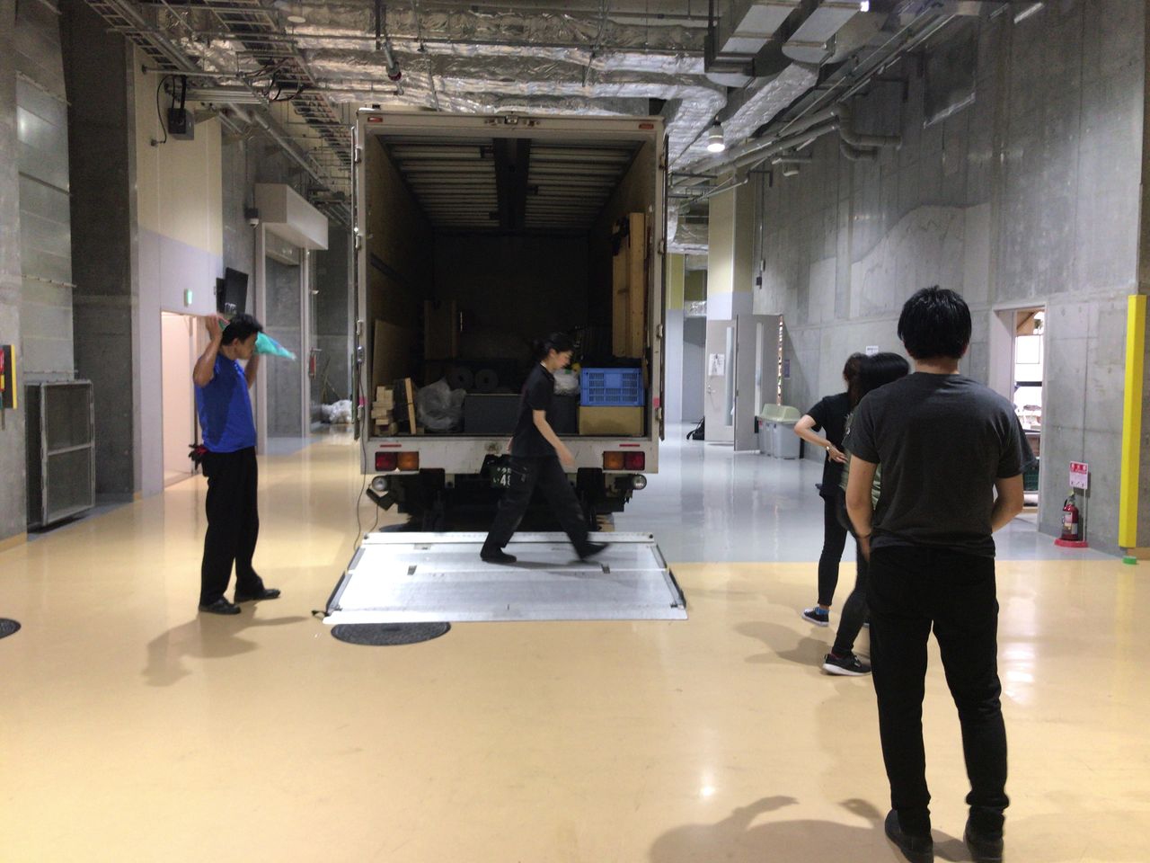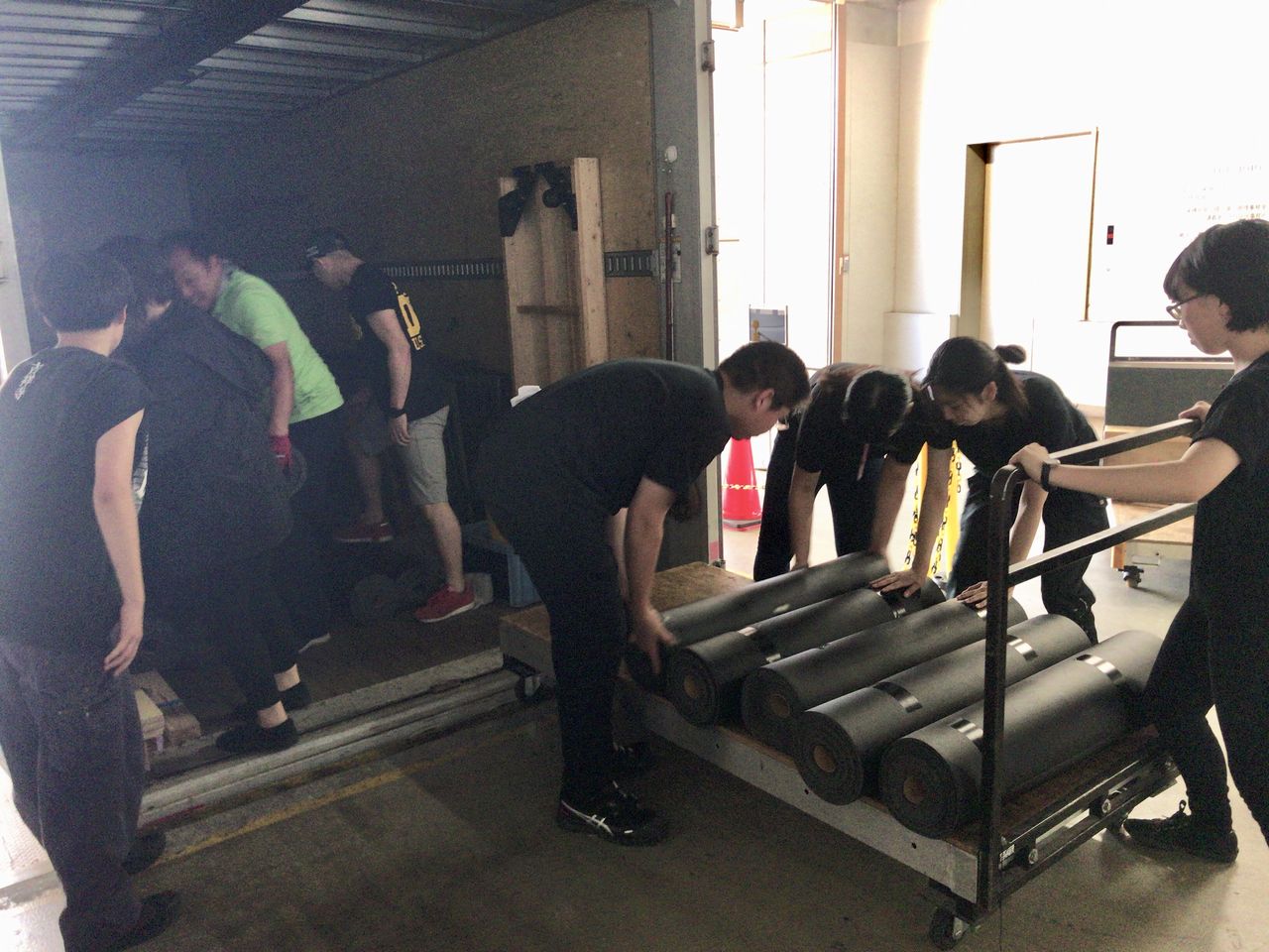 「第24回 高校演劇サマーフェスティバル」にて使用する照明関連機材と舞台にて使用する資材などの積み込み作業です。