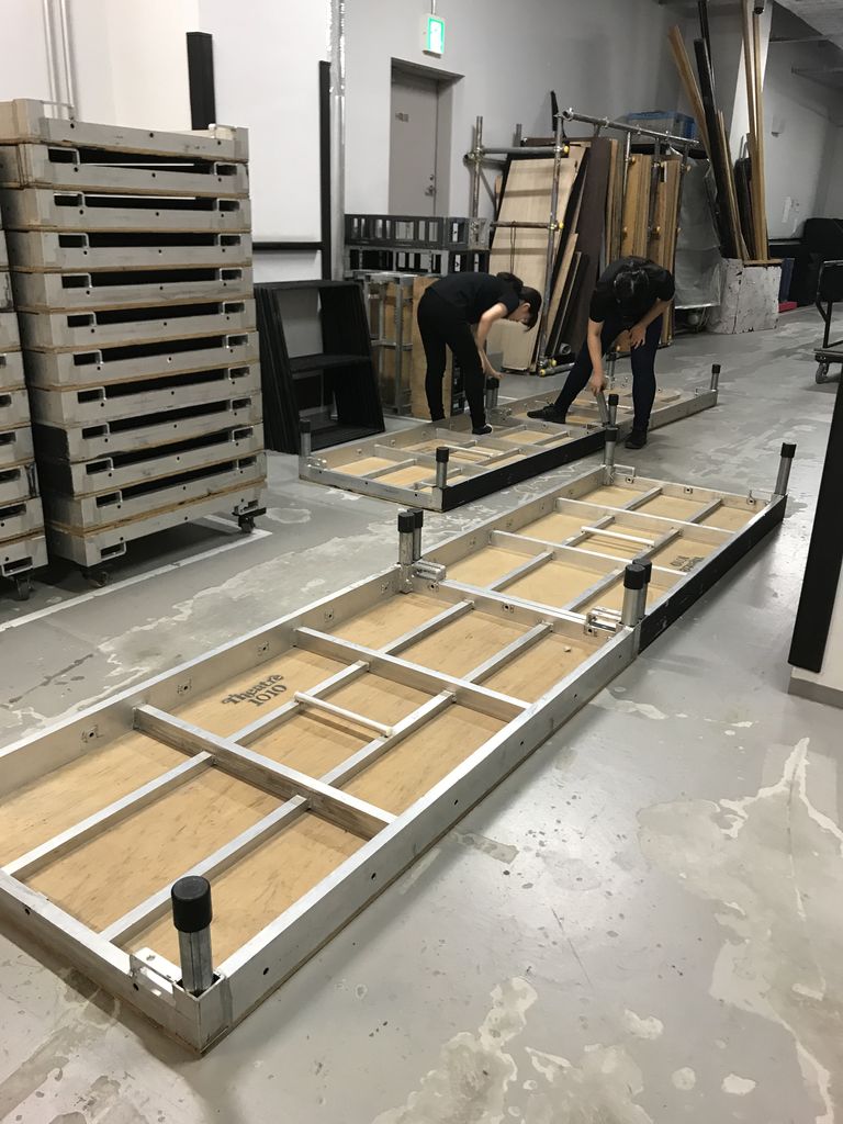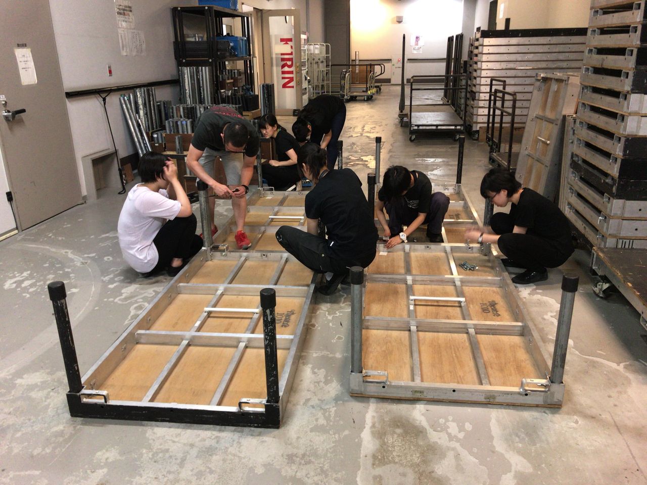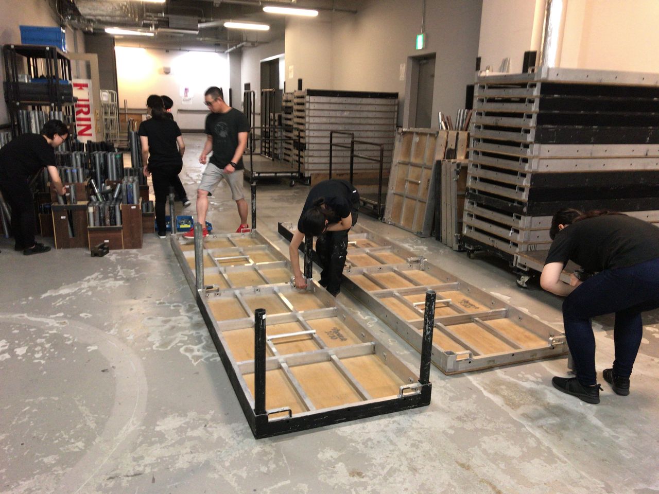 その間に演出部は、搬入口でアルミデッキで台を組みます。