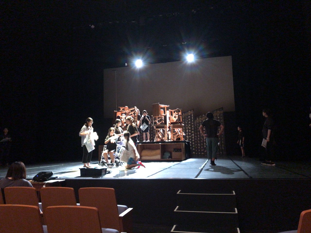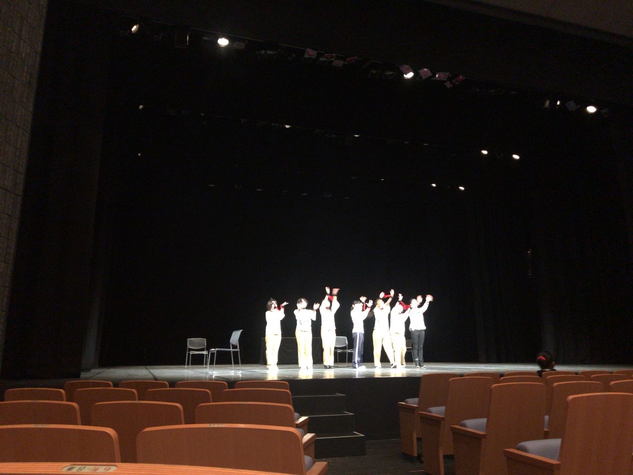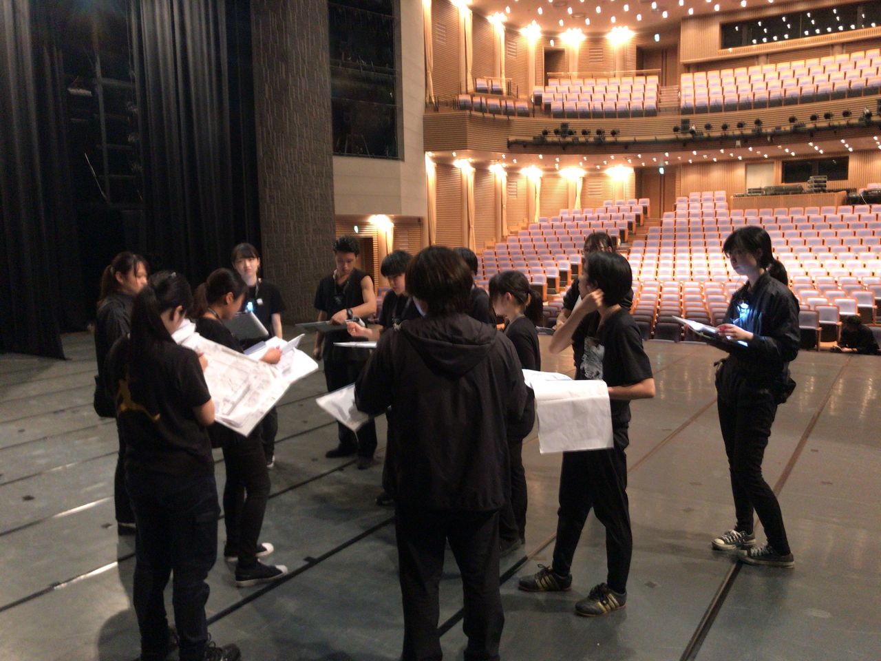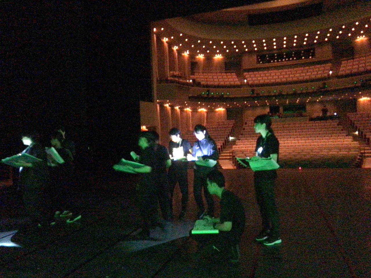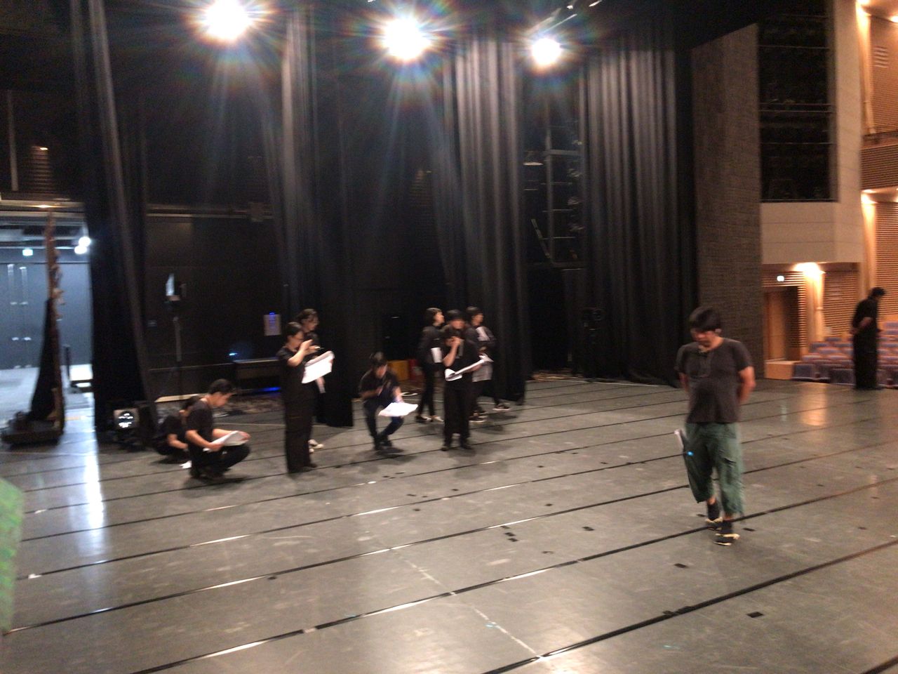 照明チームが舞台上で回線チェック中は舞台が暗いので、演出部は通路側にて本日リハーサルの準備をします。