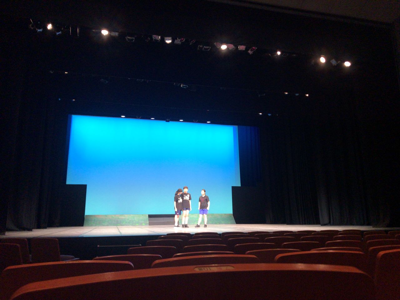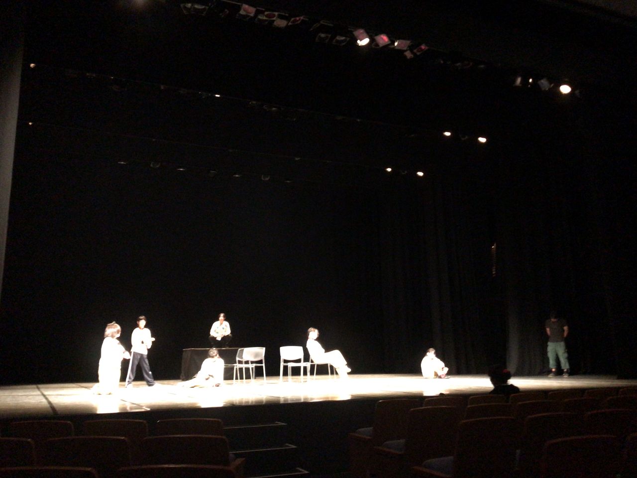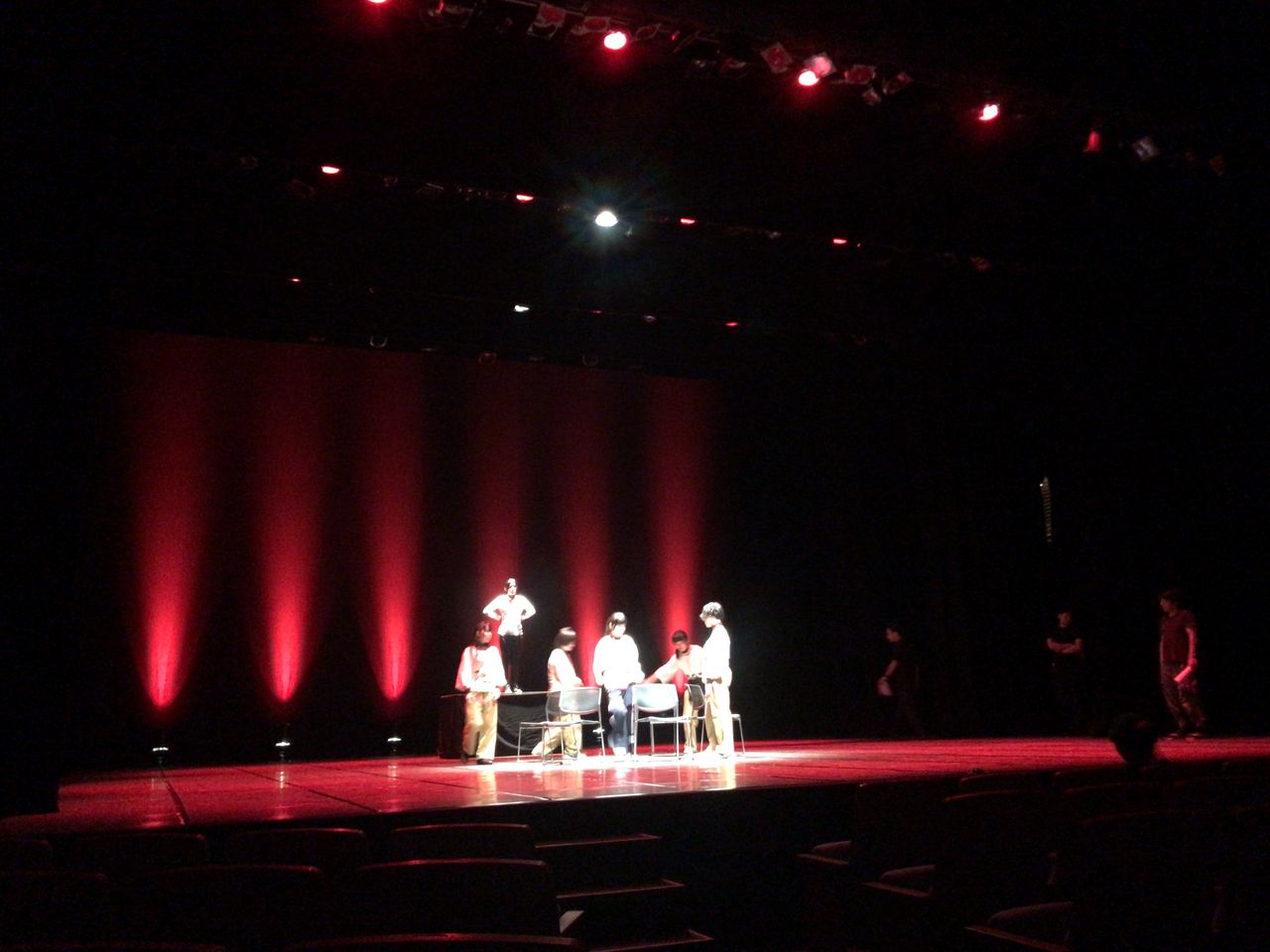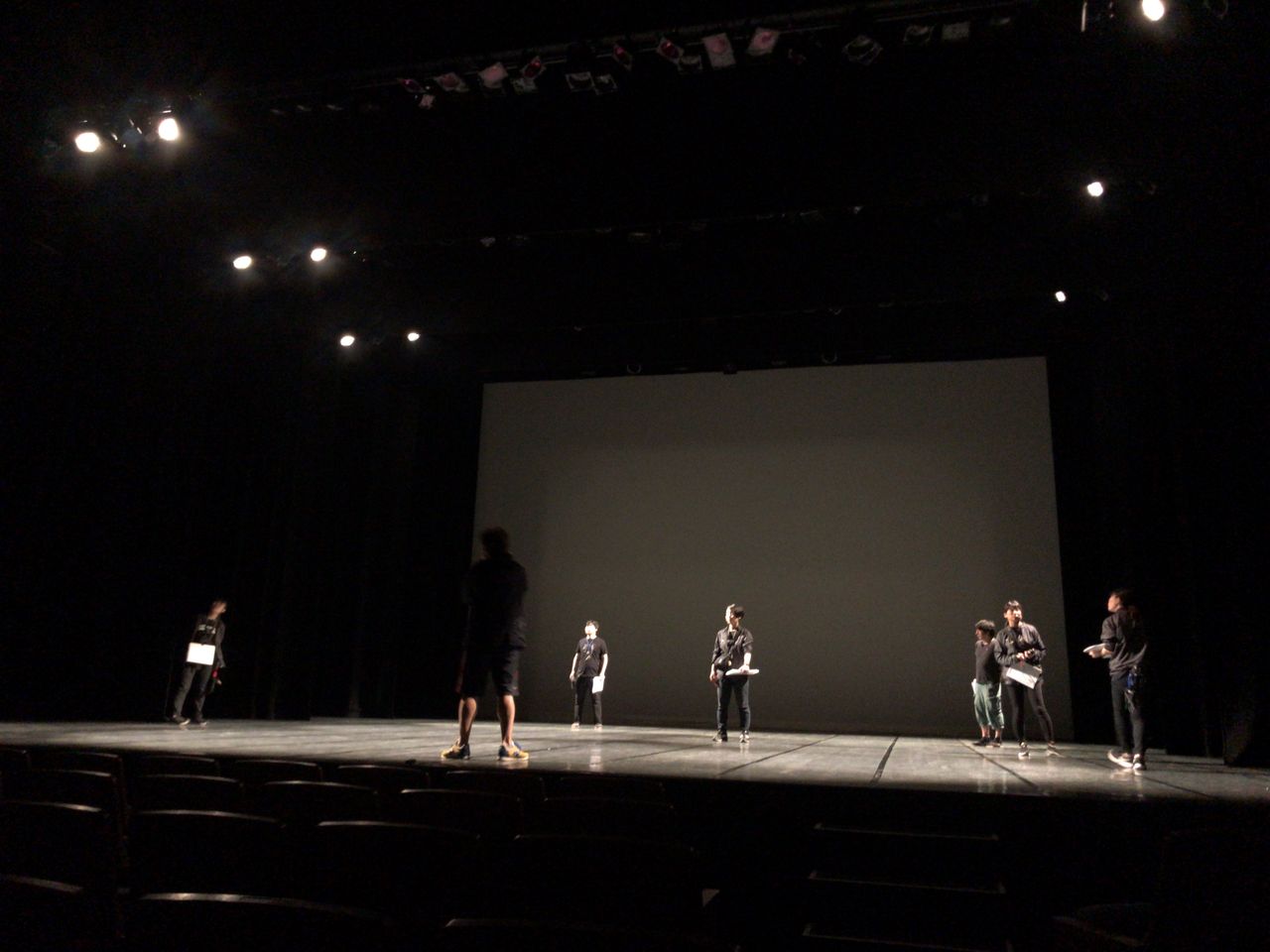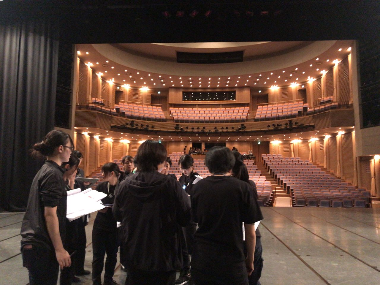 照明チームが舞台上で回線チェック中は舞台が暗いので、演出部は通路側にて本日リハーサルの準備をします。