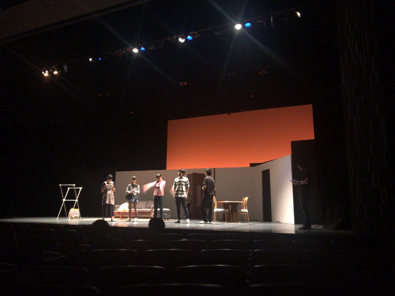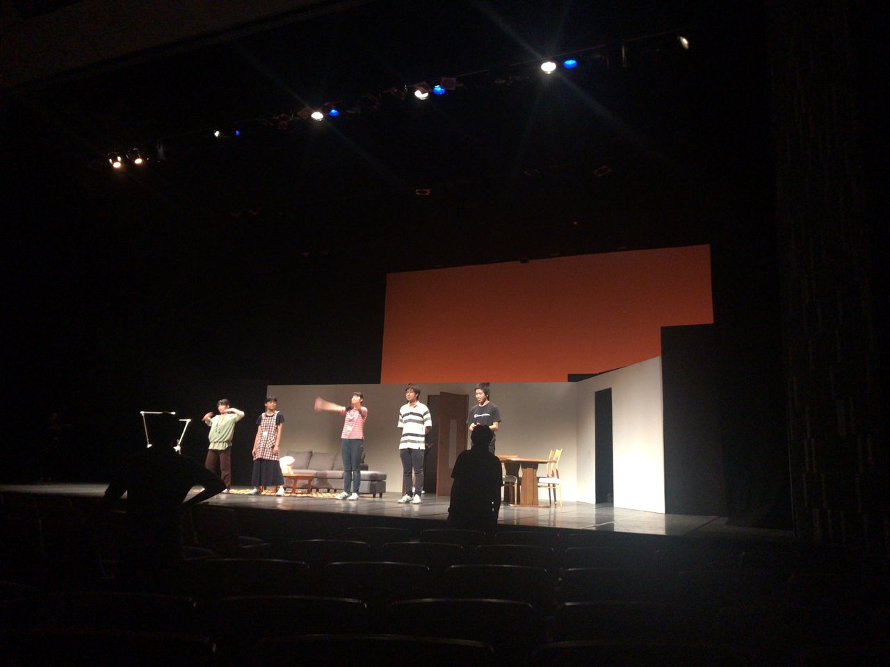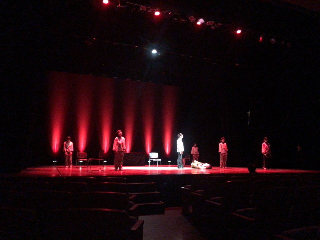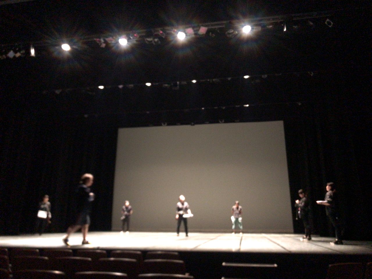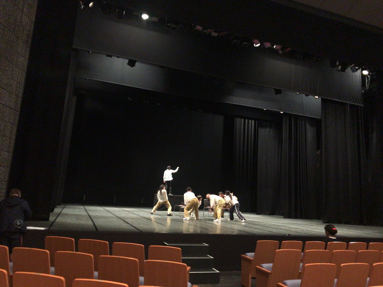 照明チームが舞台上で回線チェック中は舞台が暗いので、演出部は通路側にて本日リハーサルの準備をします。