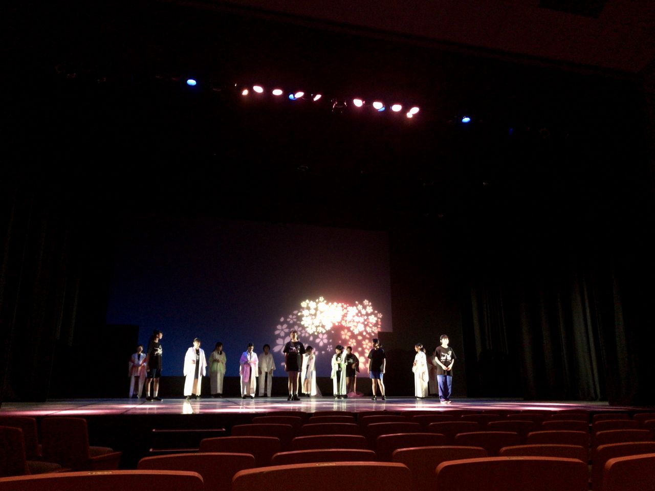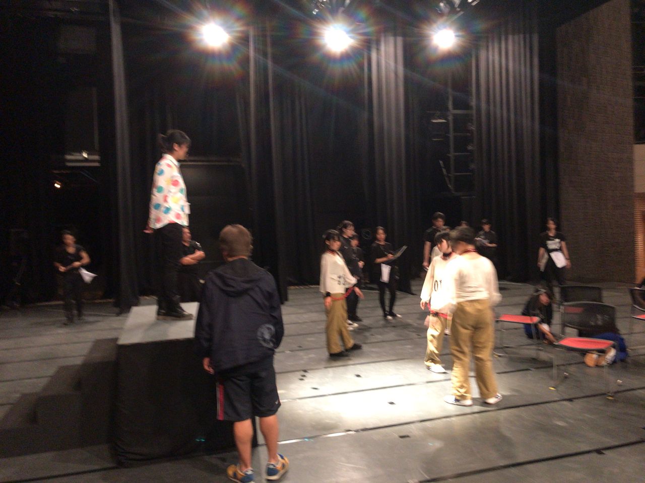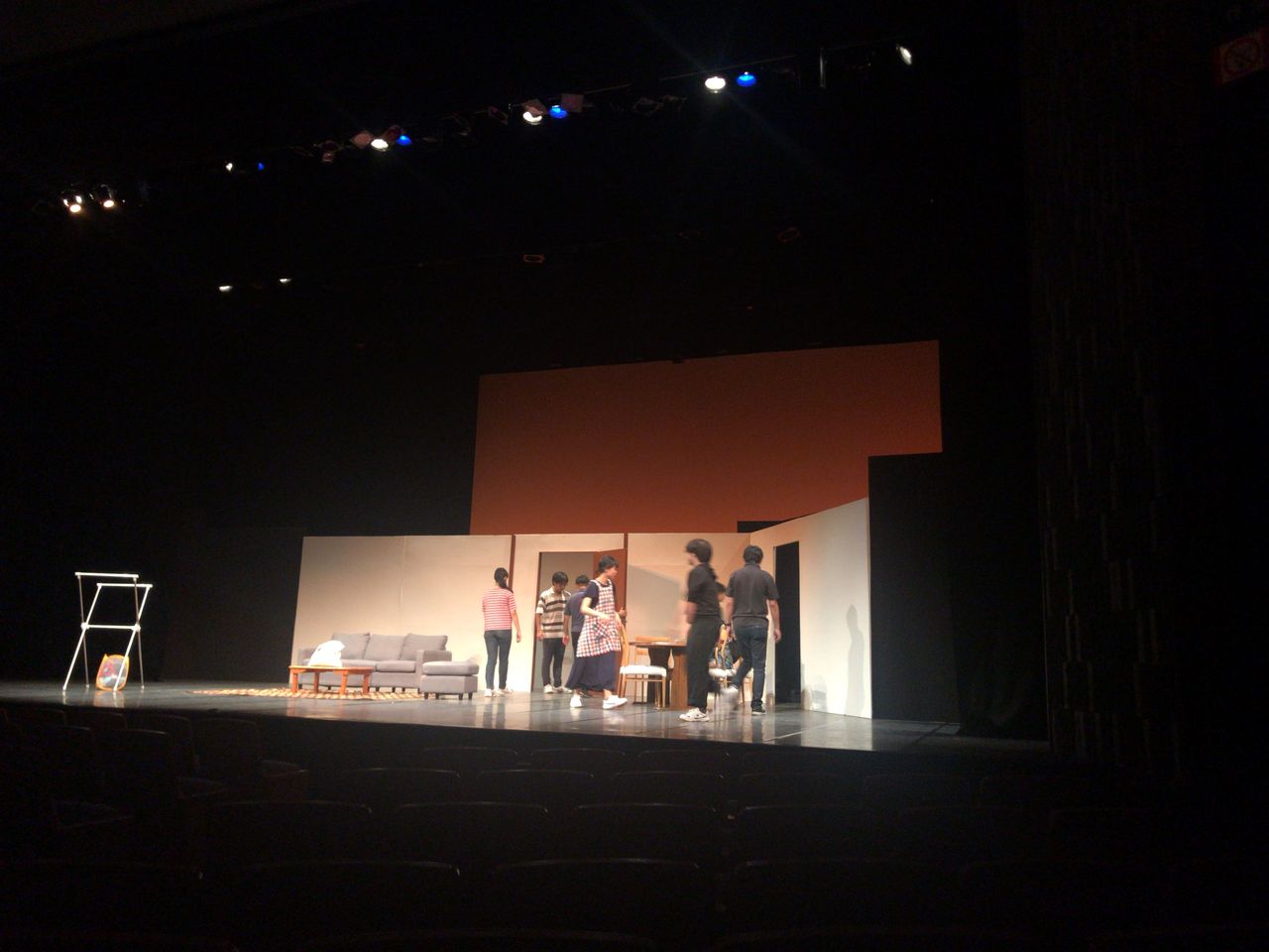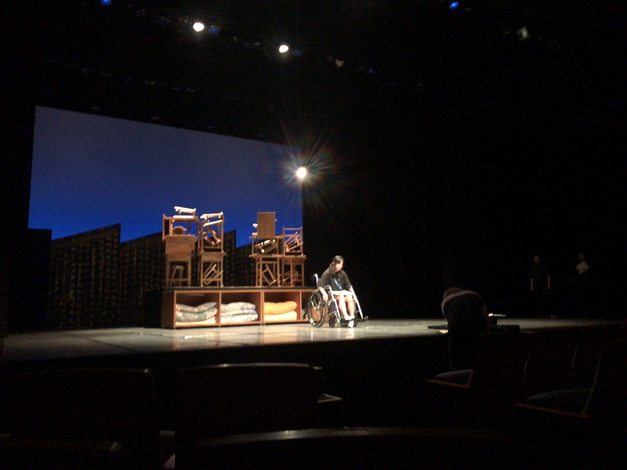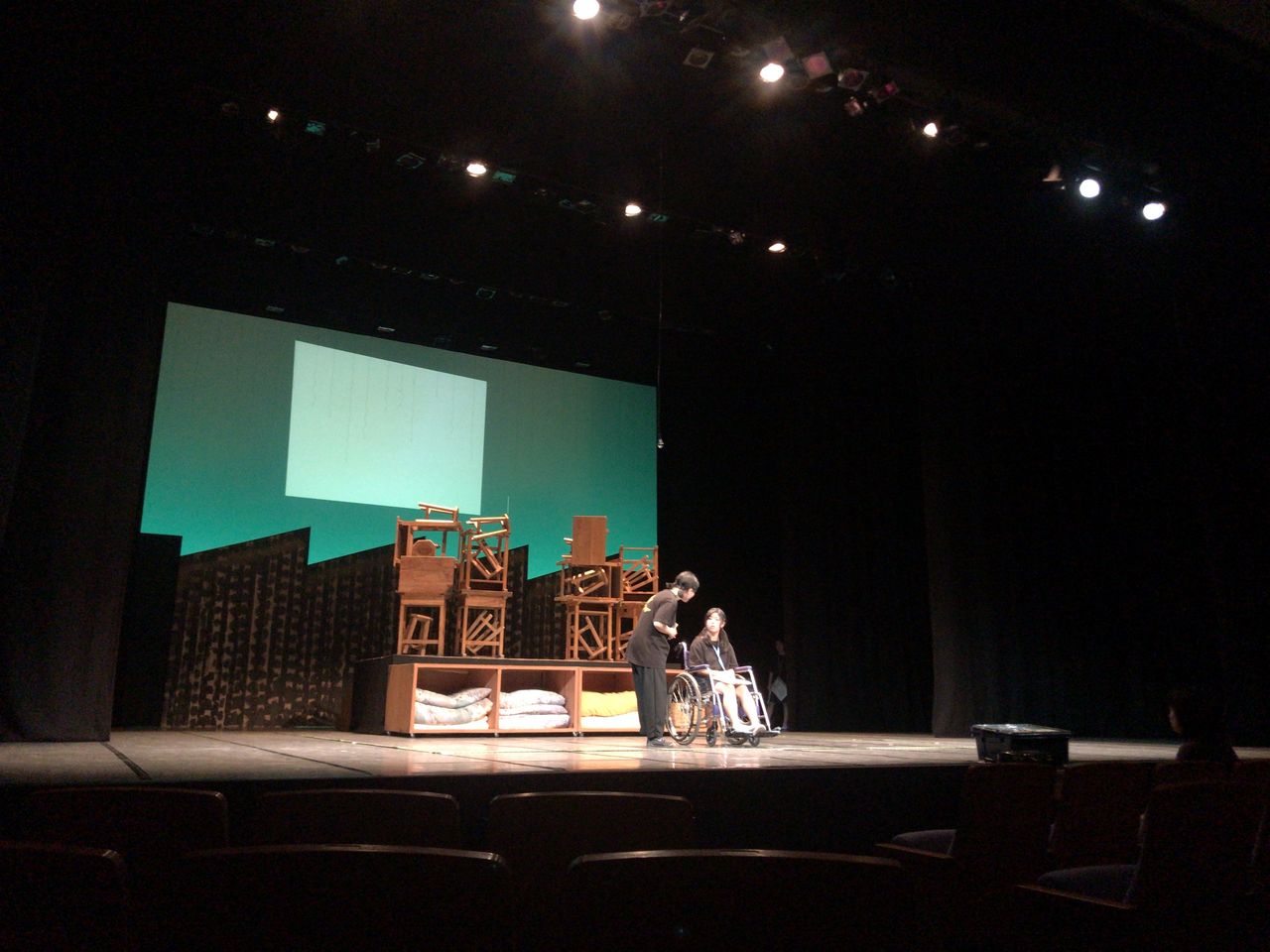 照明チームが舞台上で回線チェック中は舞台が暗いので、演出部は通路側にて本日リハーサルの準備をします。