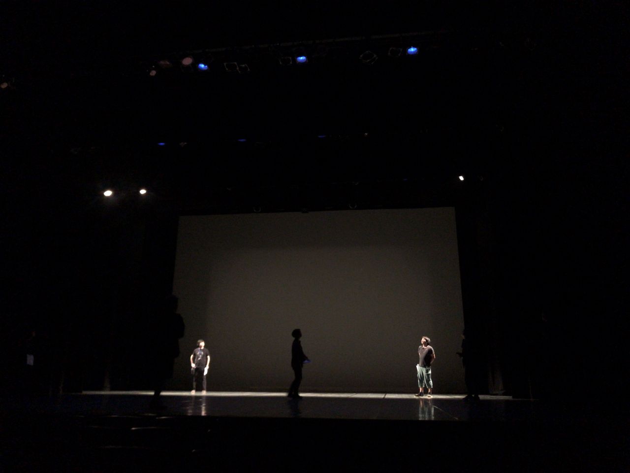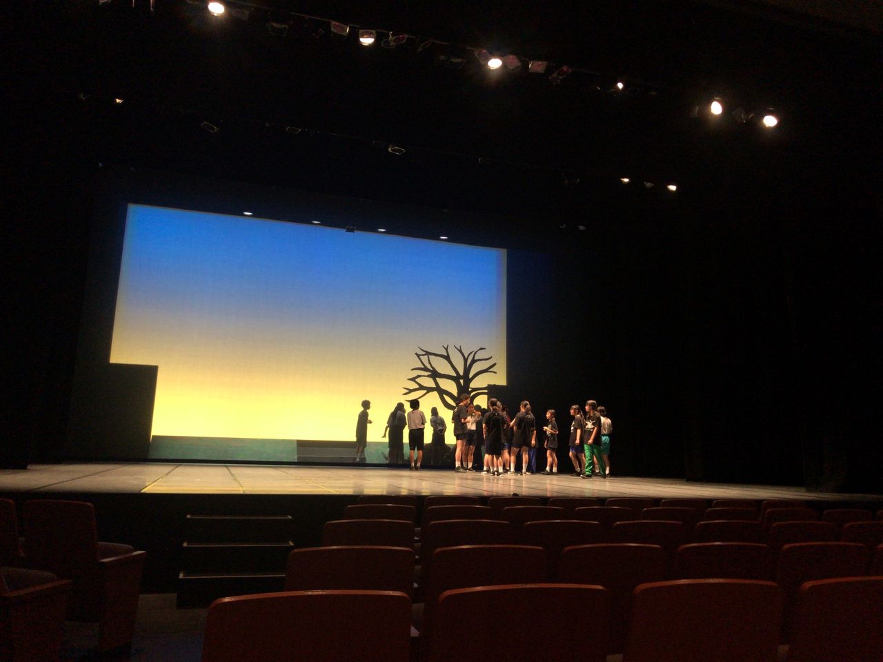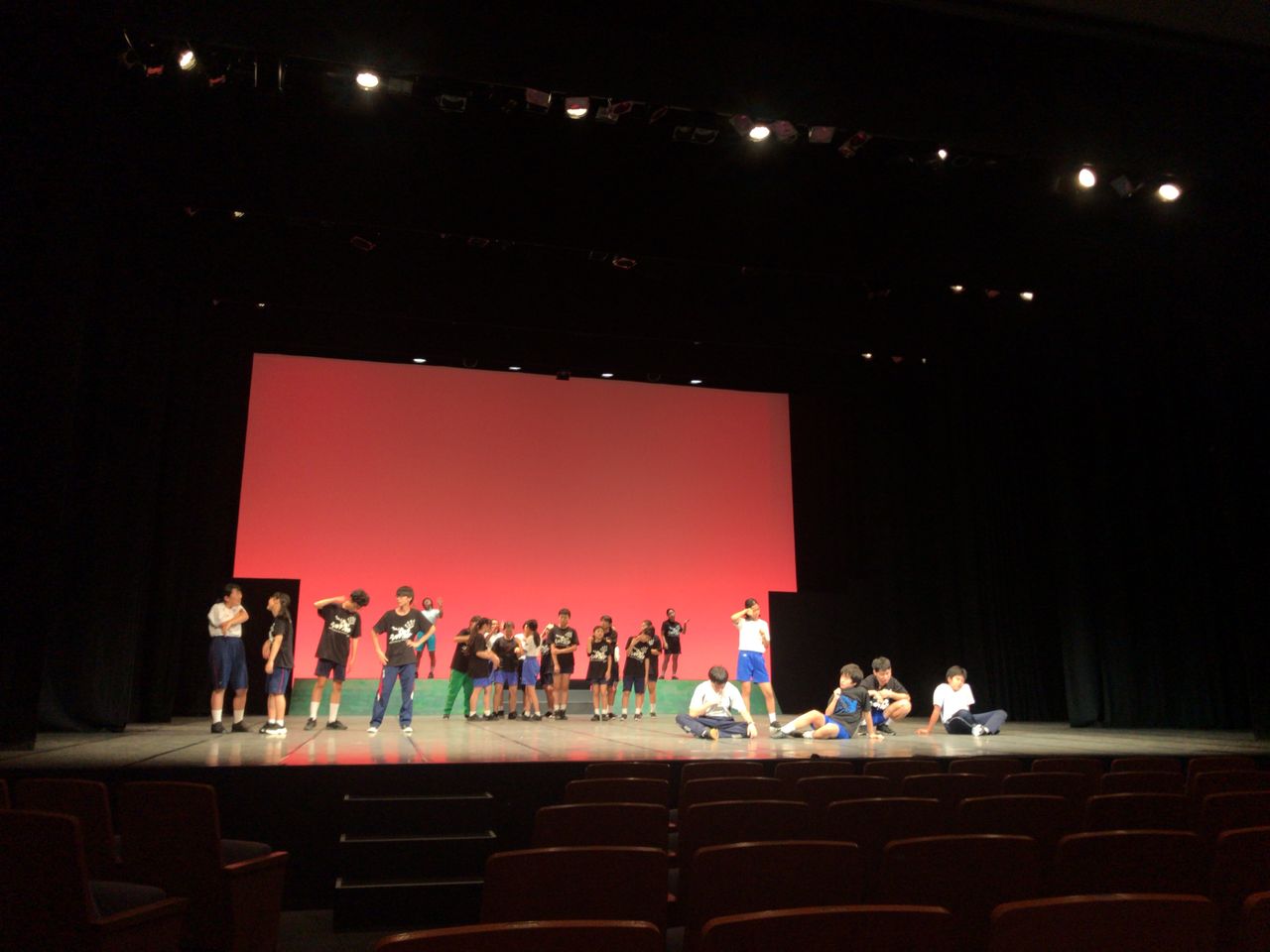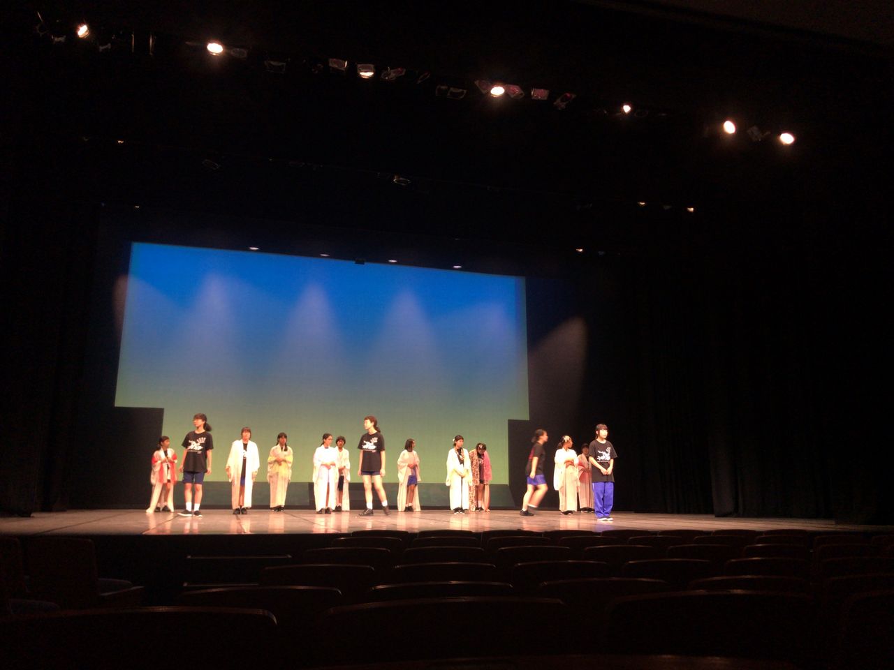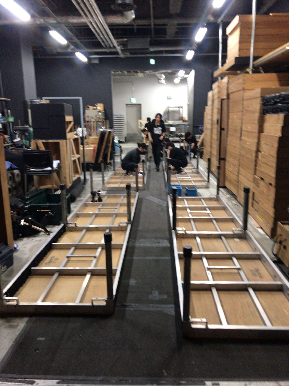 照明チームが舞台上で回線チェック中は舞台が暗いので、演出部は通路側にて本日リハーサルの準備をします。