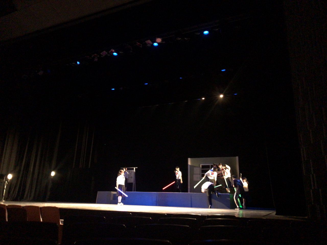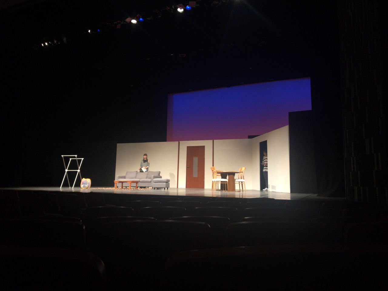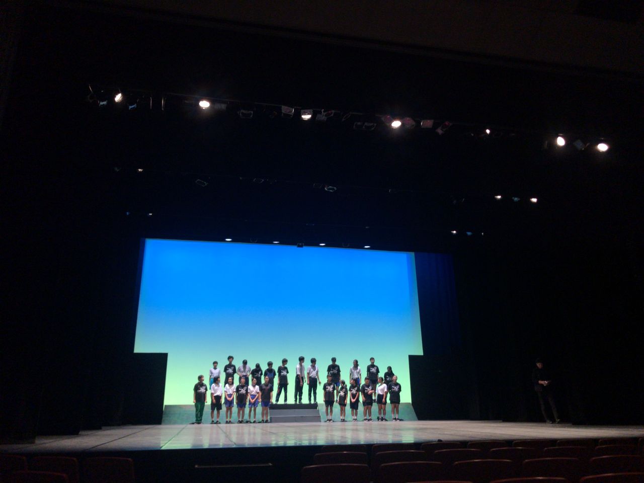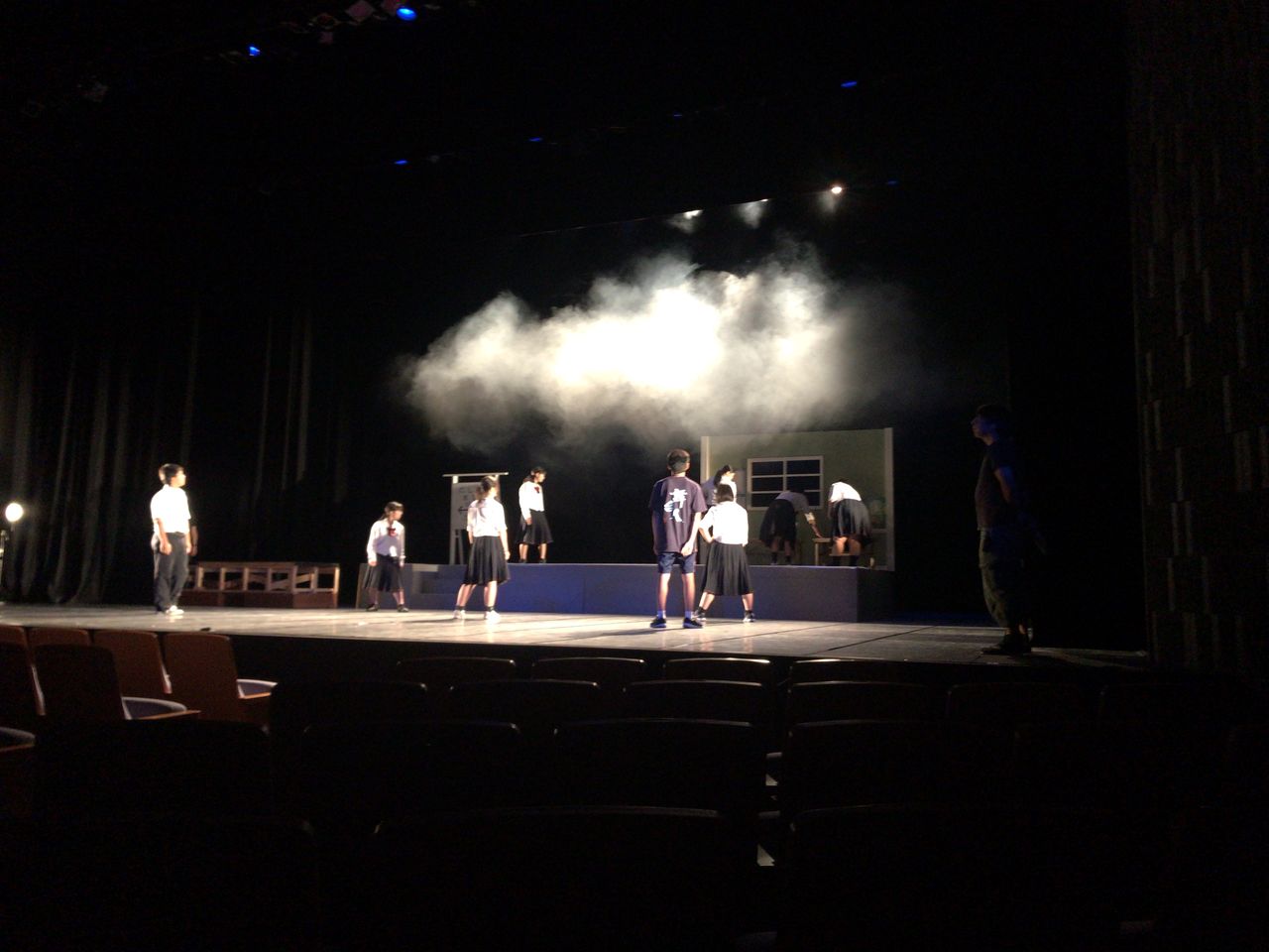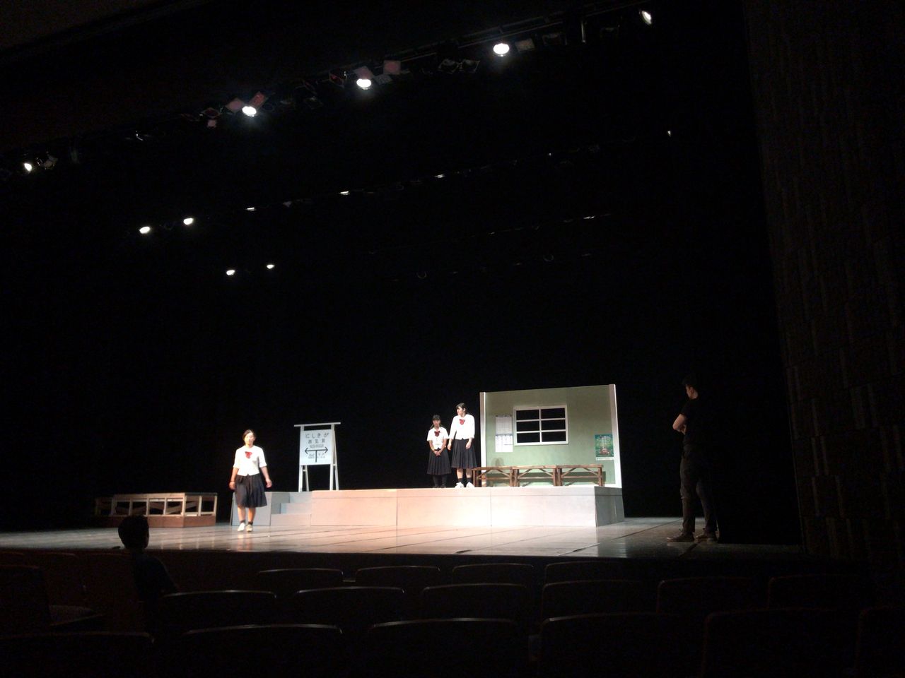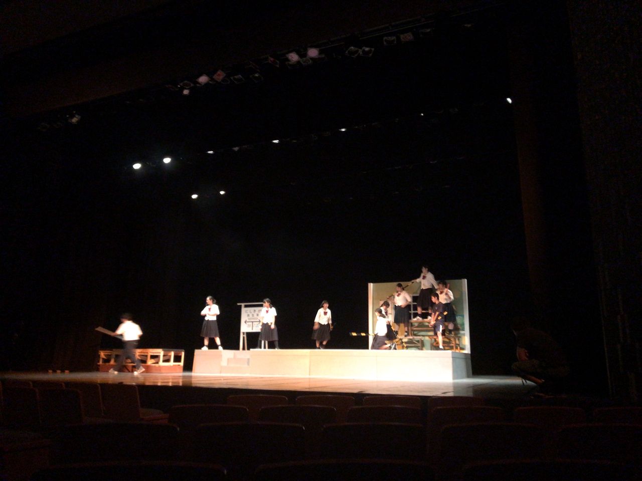 照明チームが舞台上で回線チェック中は舞台が暗いので、演出部は通路側にて本日リハーサルの準備をします。