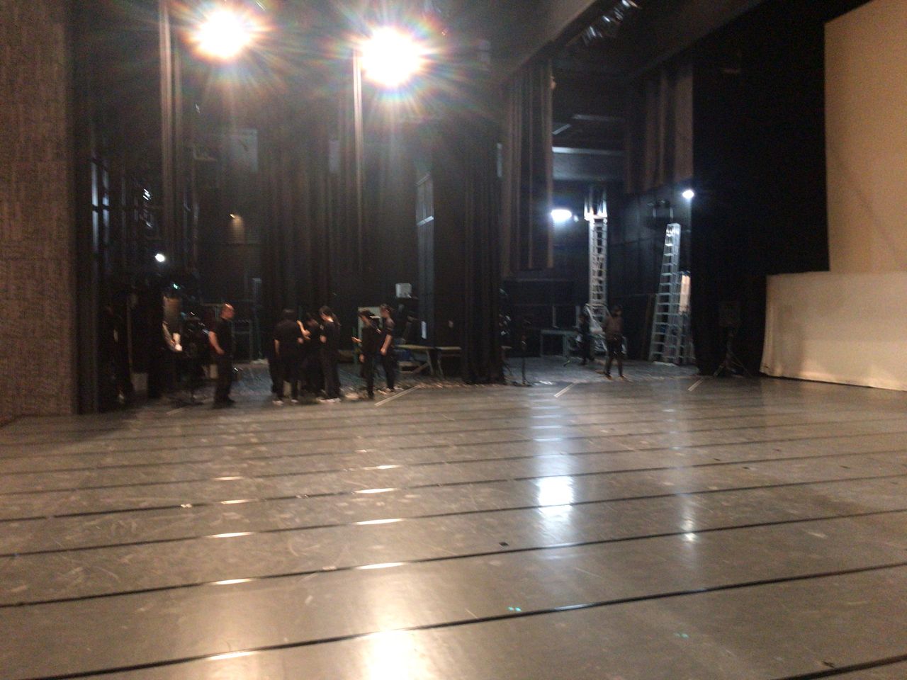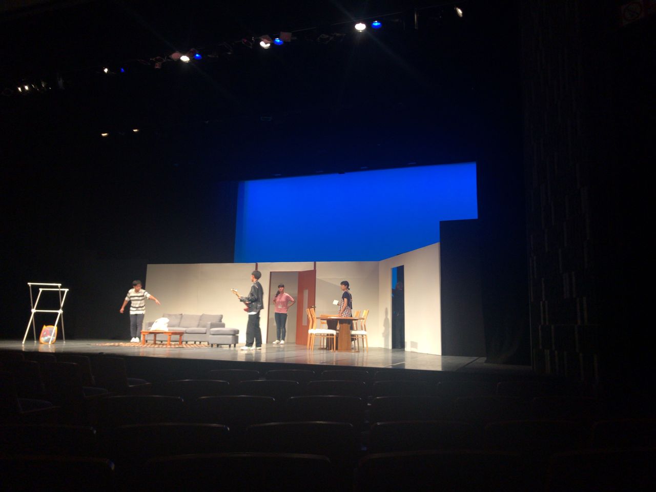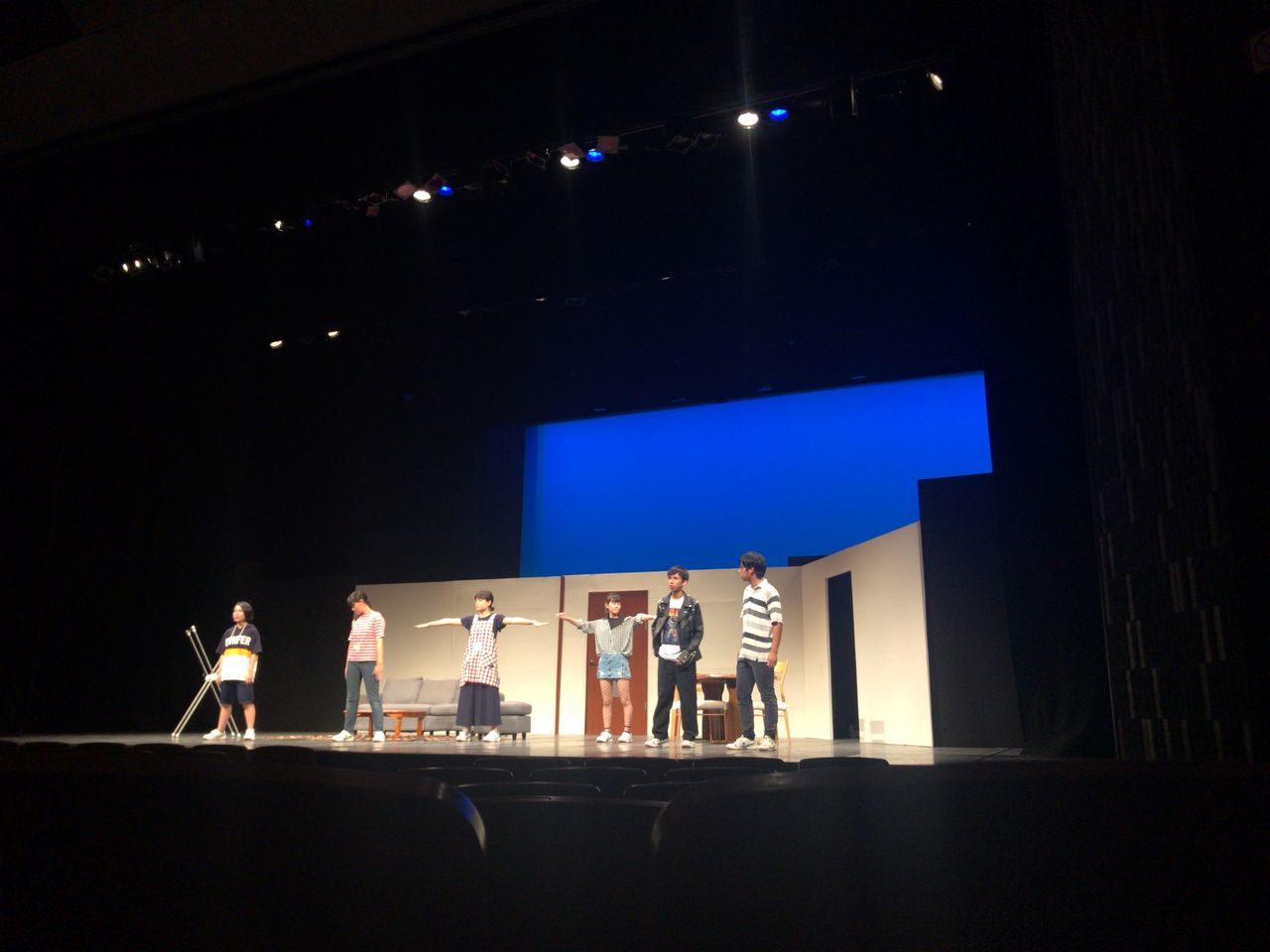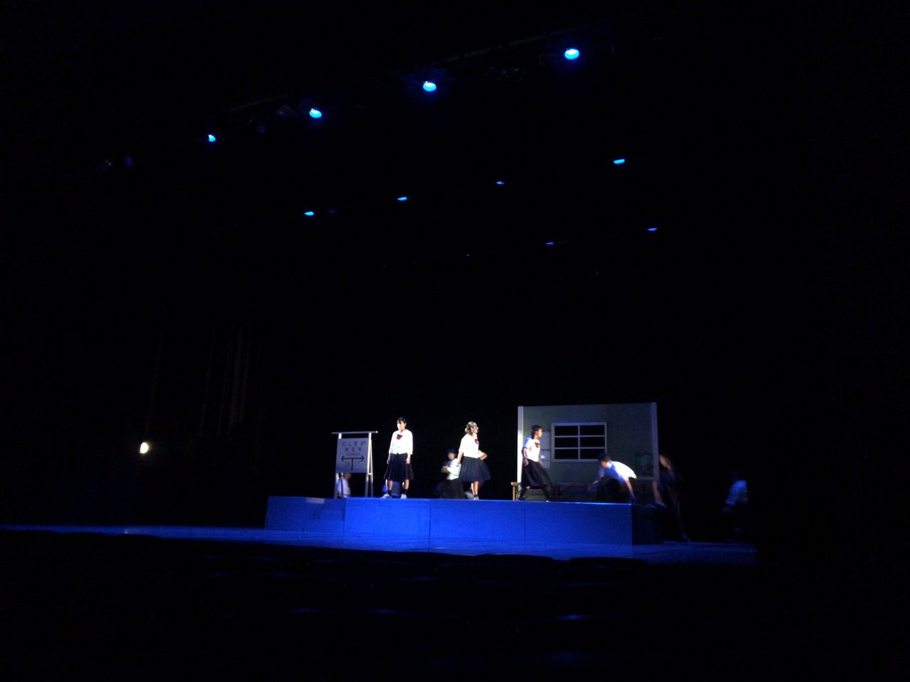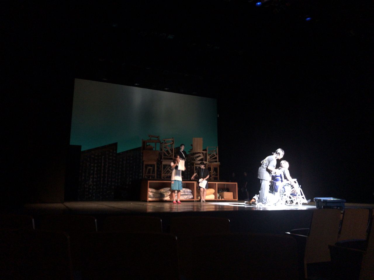 照明チームが舞台上で回線チェック中は舞台が暗いので、演出部は通路側にて本日リハーサルの準備をします。