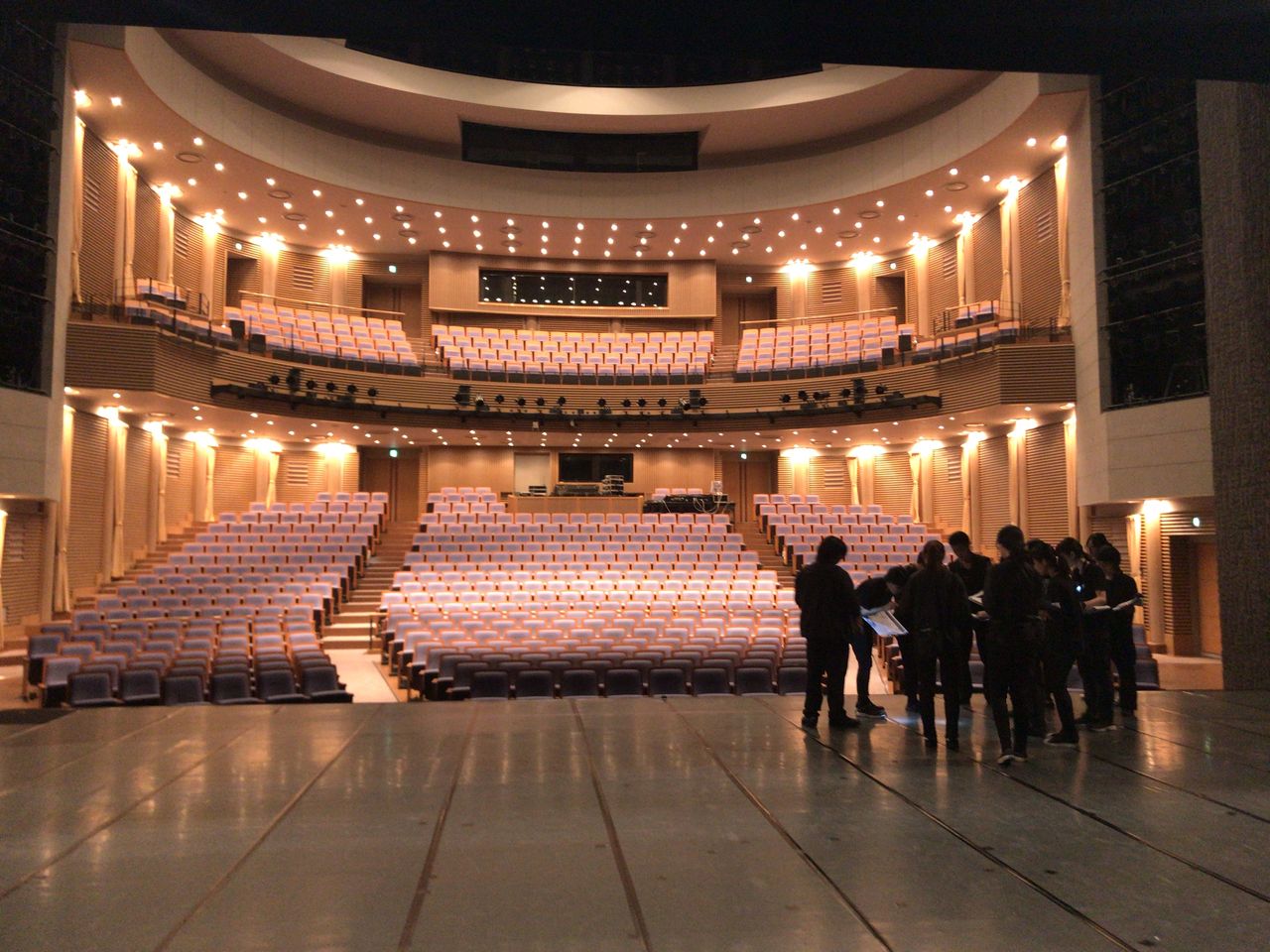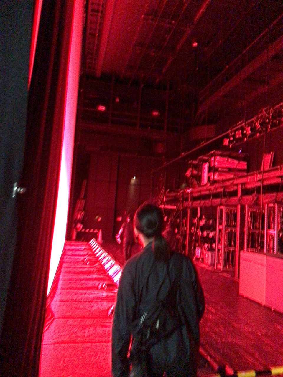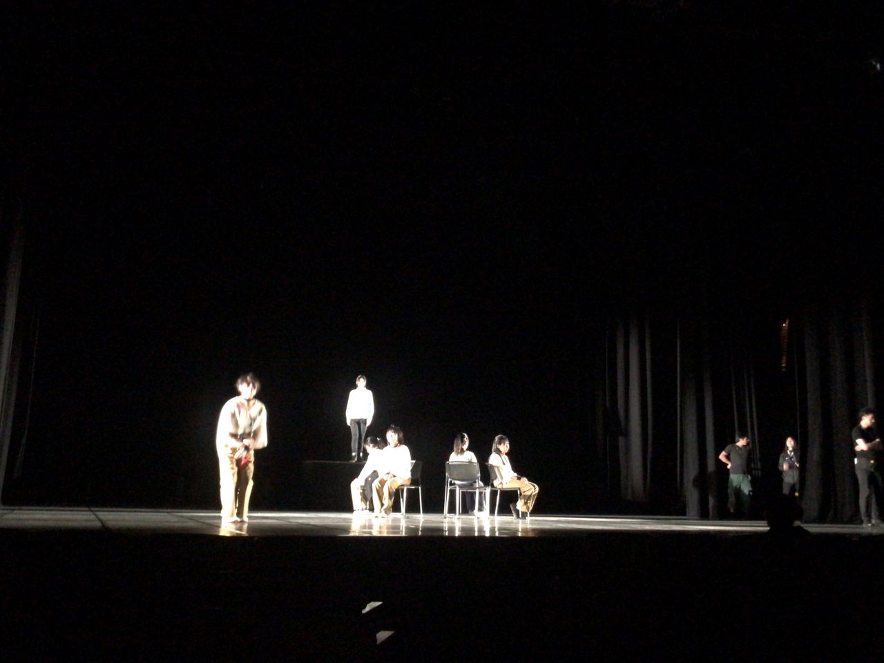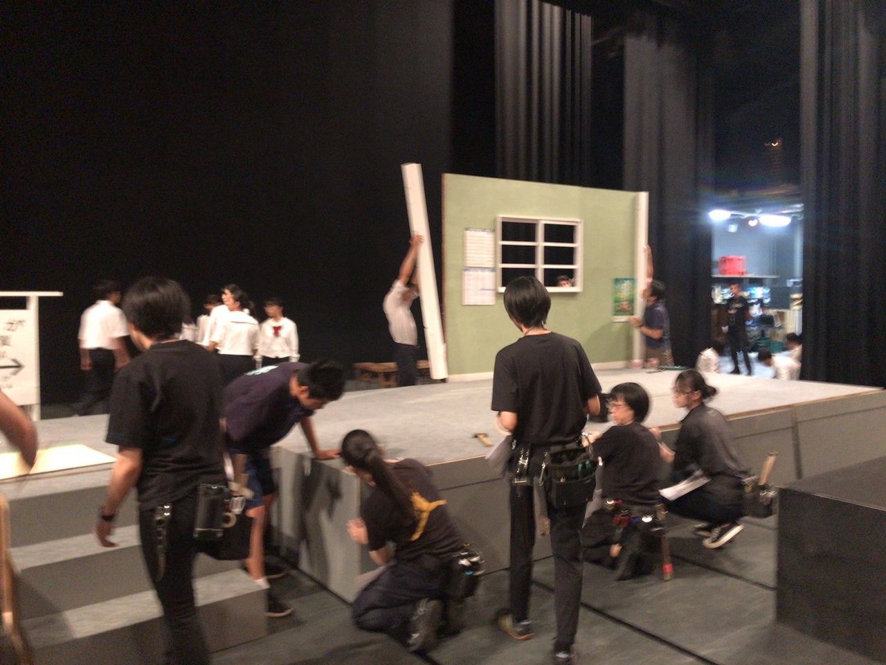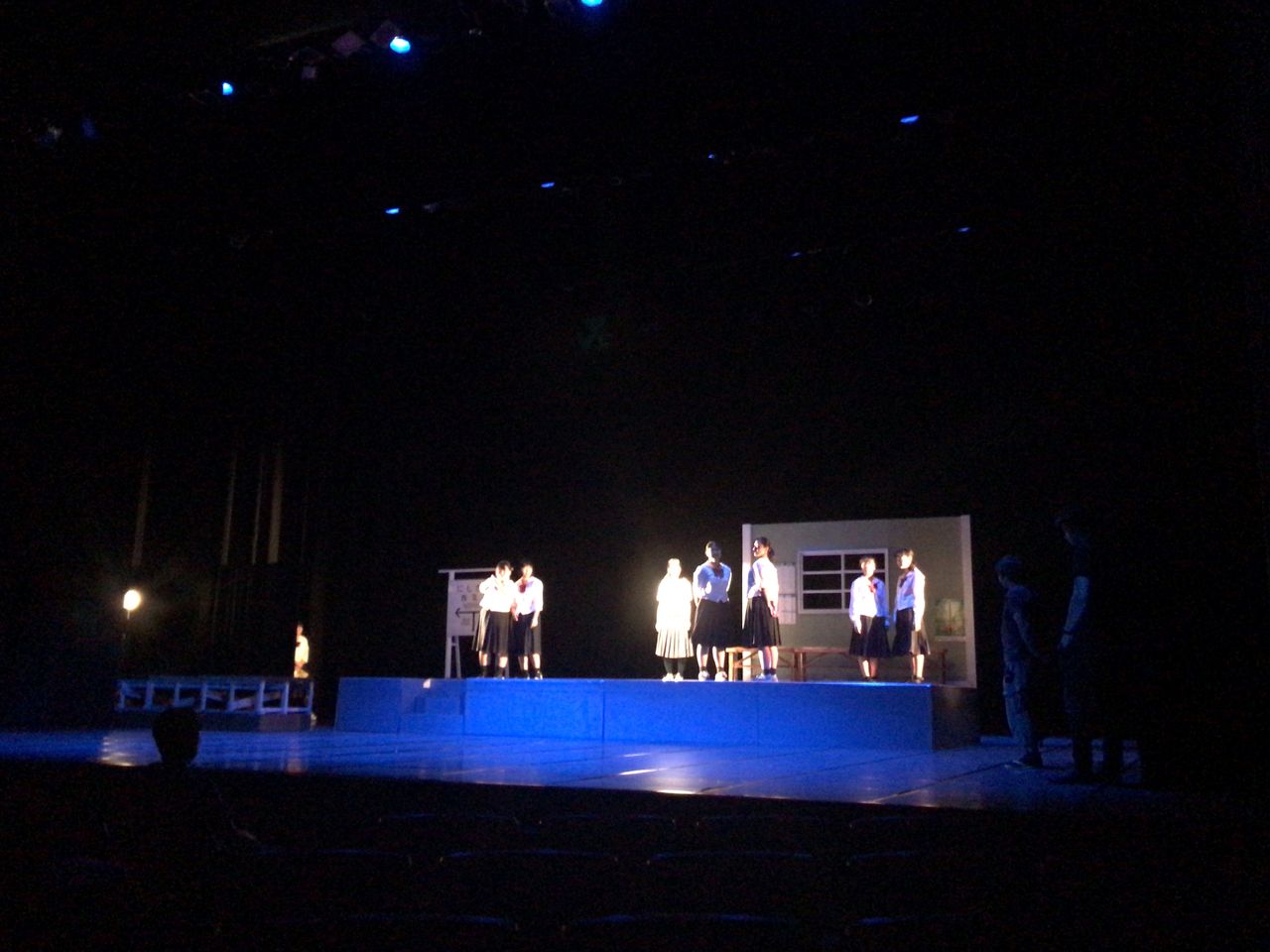 照明チームが舞台上で回線チェック中は舞台が暗いので、演出部は通路側にて本日リハーサルの準備をします。