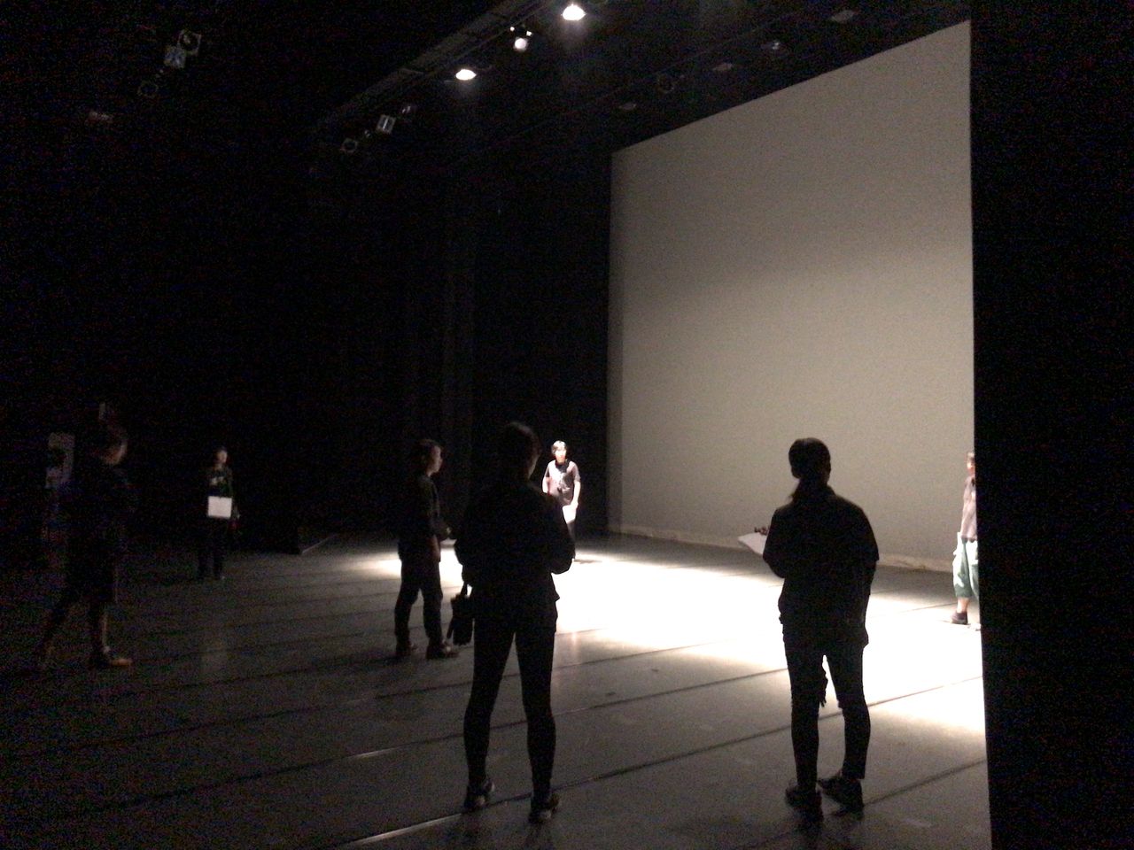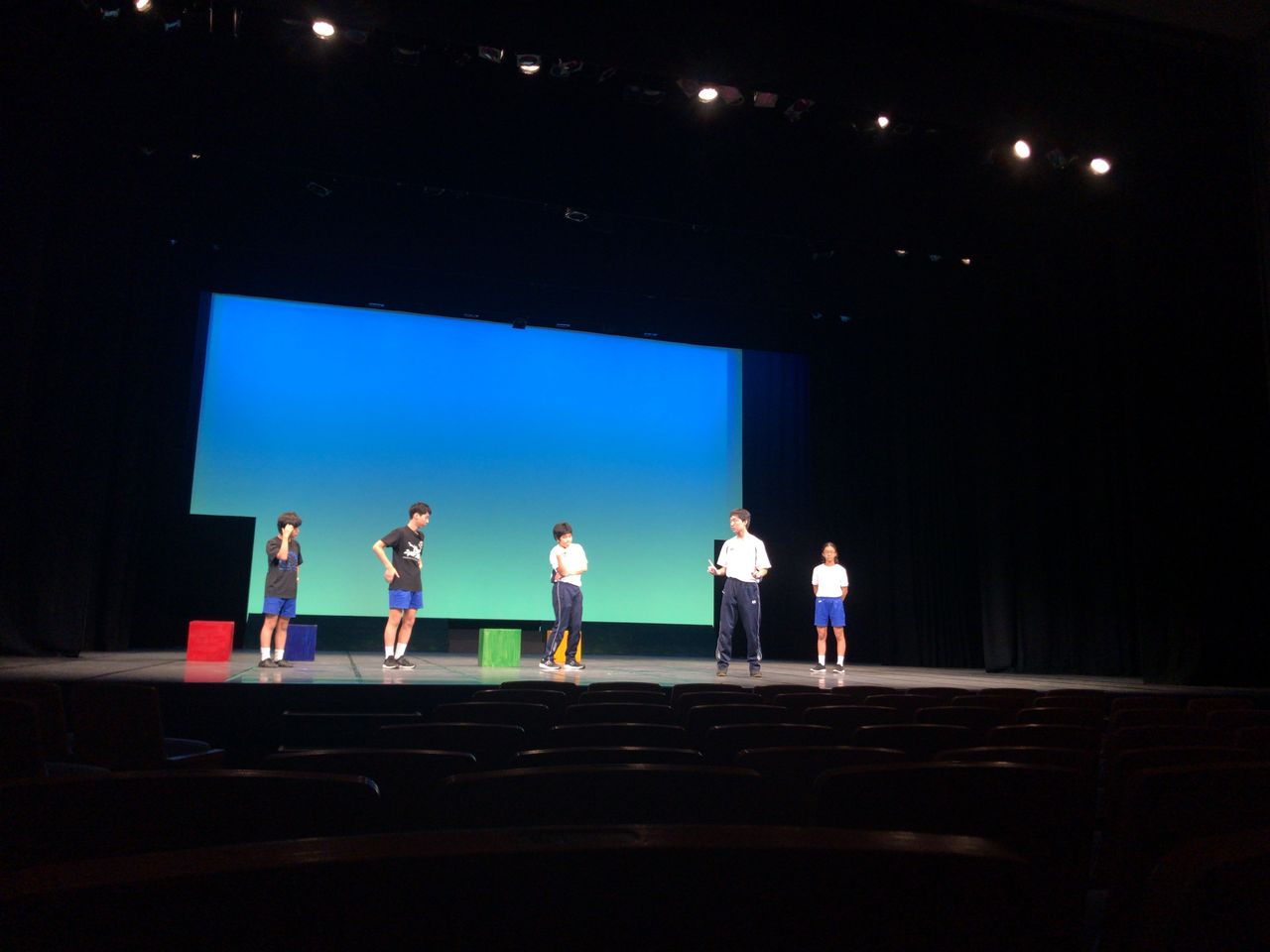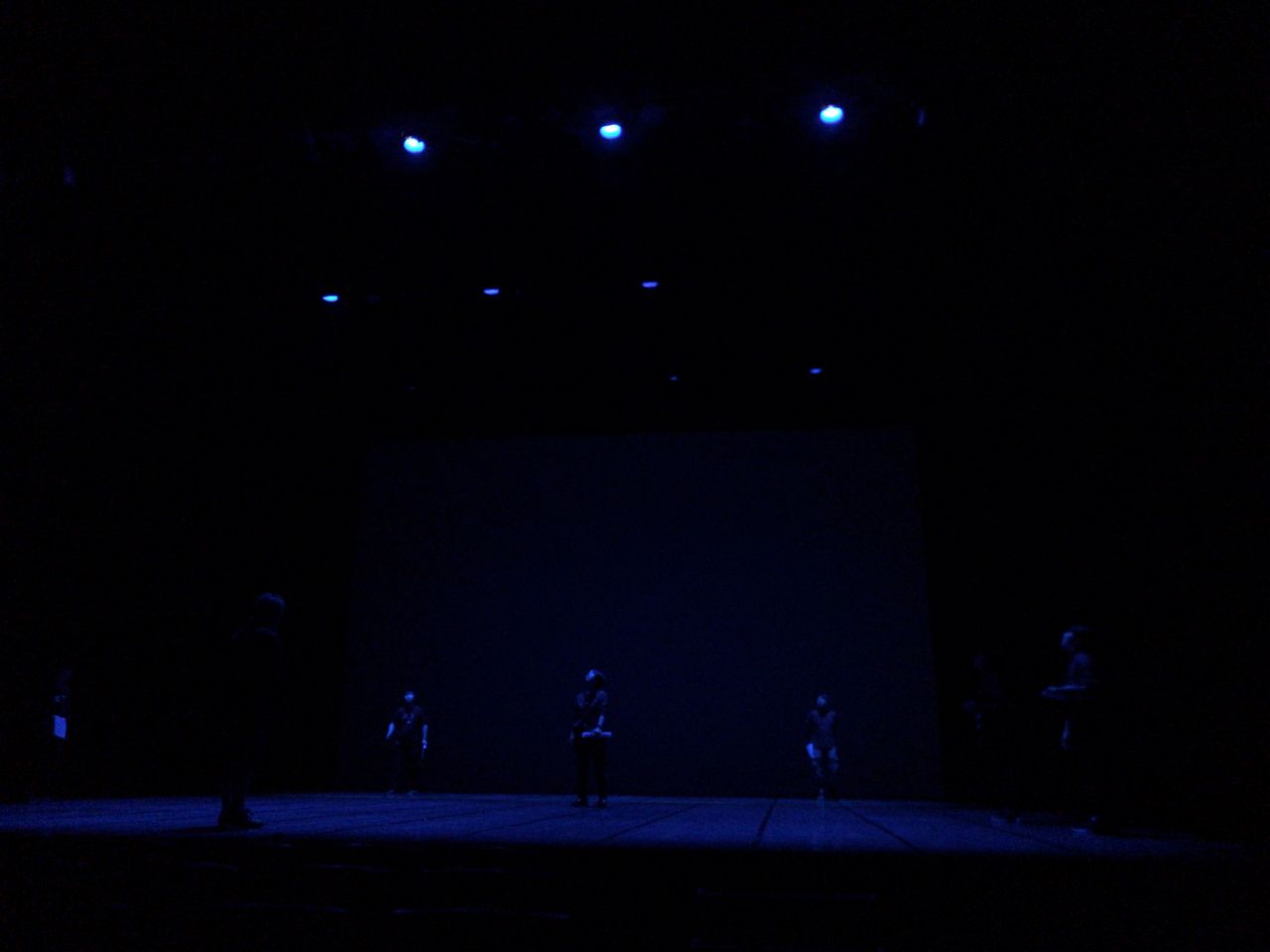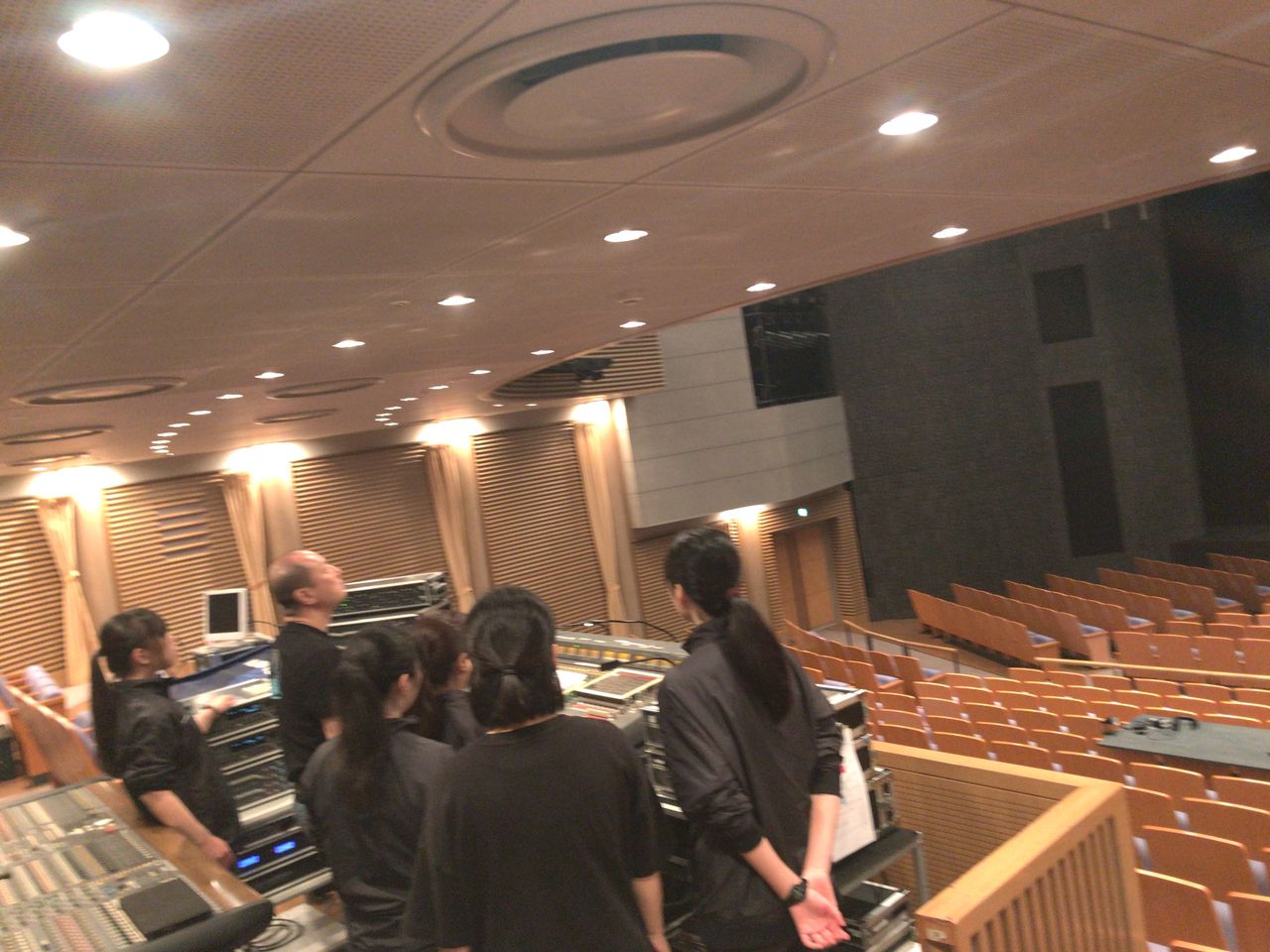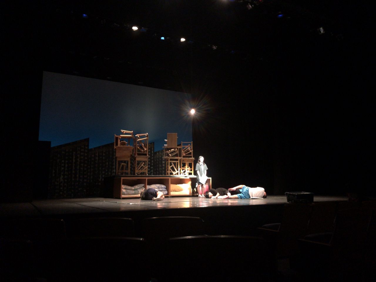 照明チームが舞台上で回線チェック中は舞台が暗いので、演出部は通路側にて本日リハーサルの準備をします。