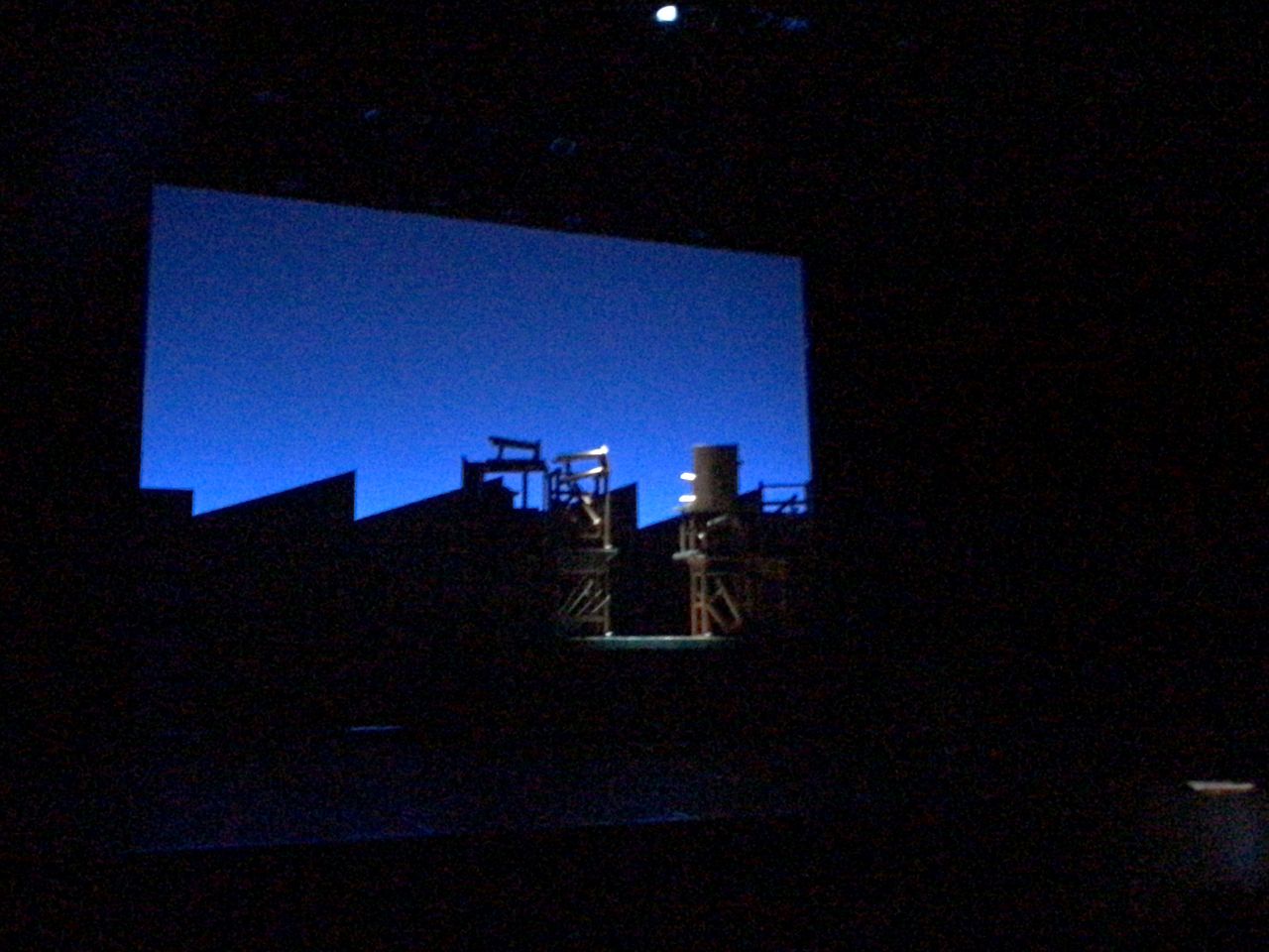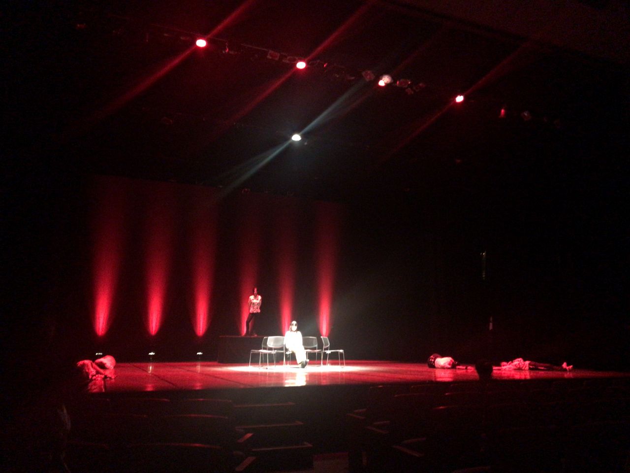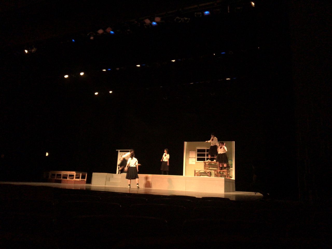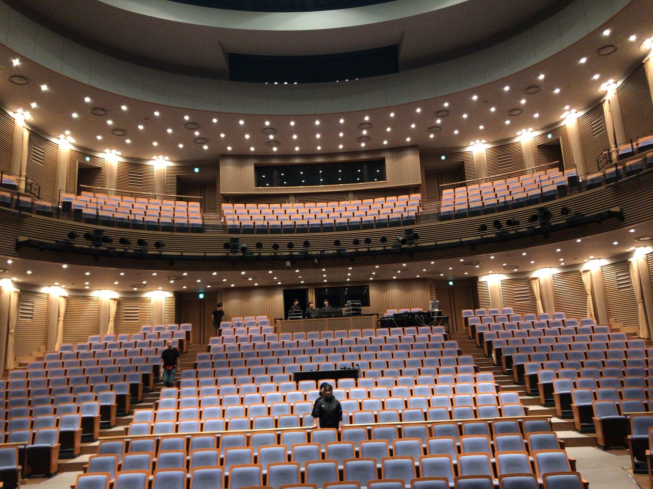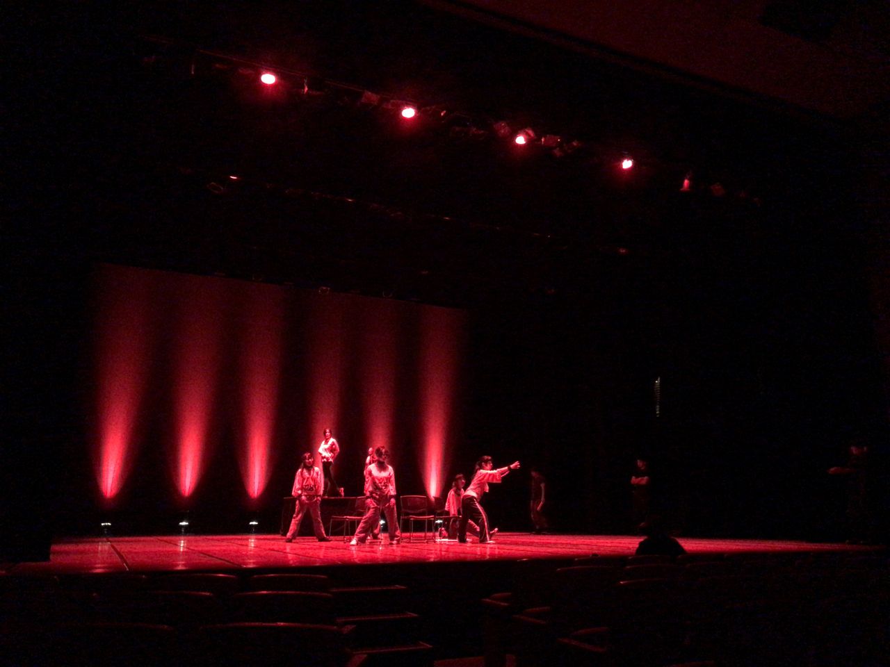 照明チームが舞台上で回線チェック中は舞台が暗いので、演出部は通路側にて本日リハーサルの準備をします。