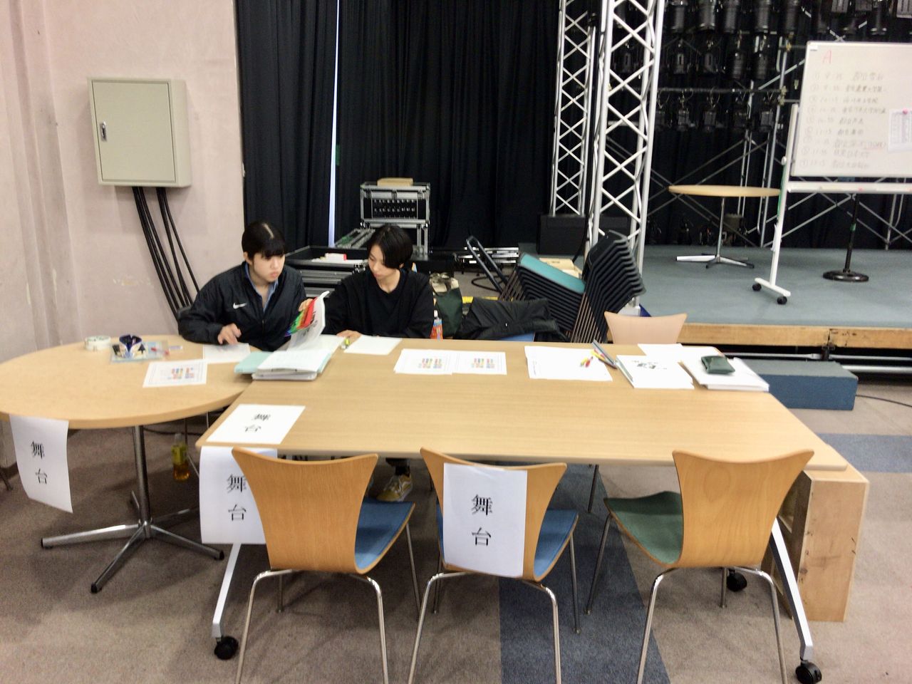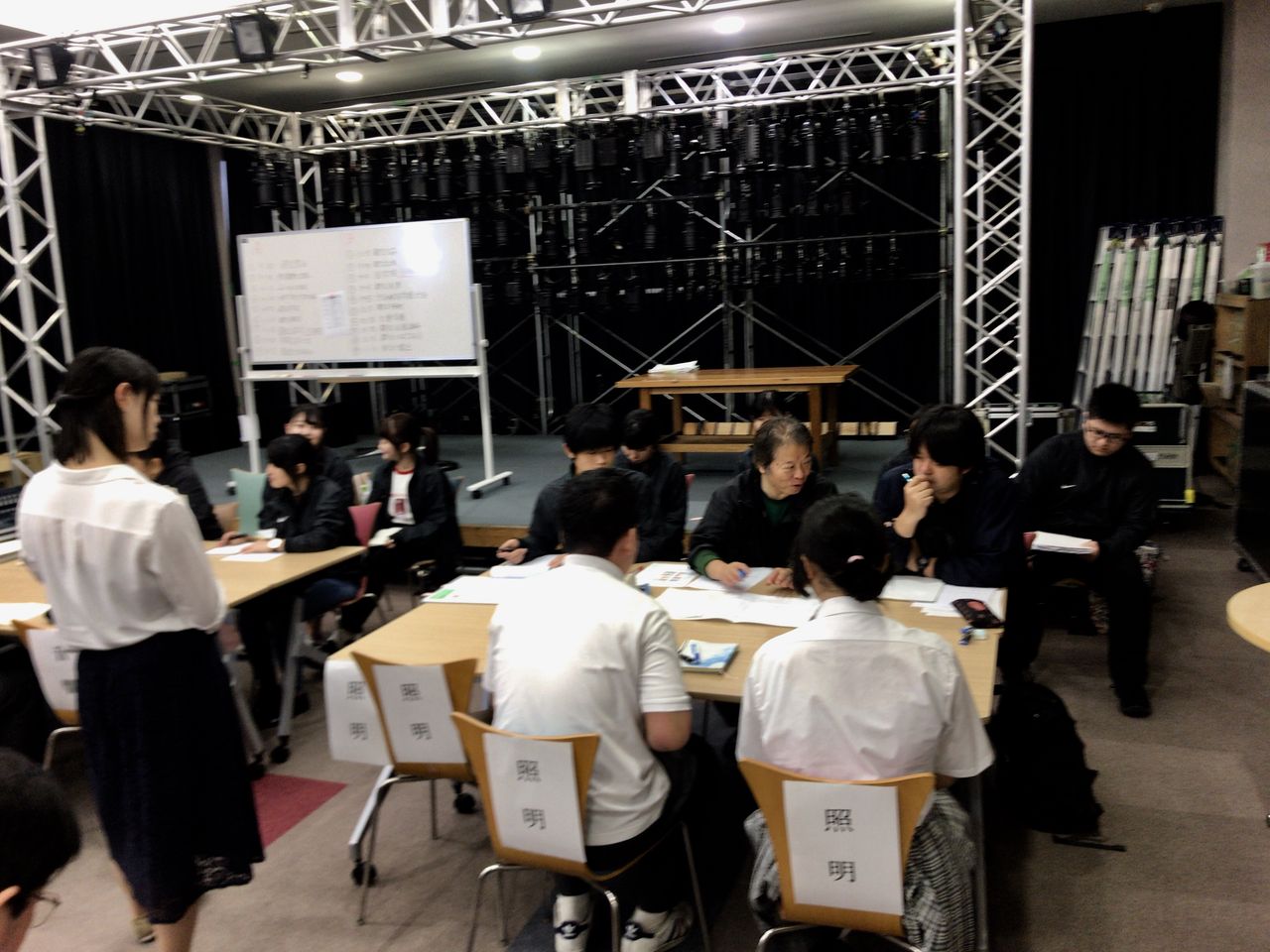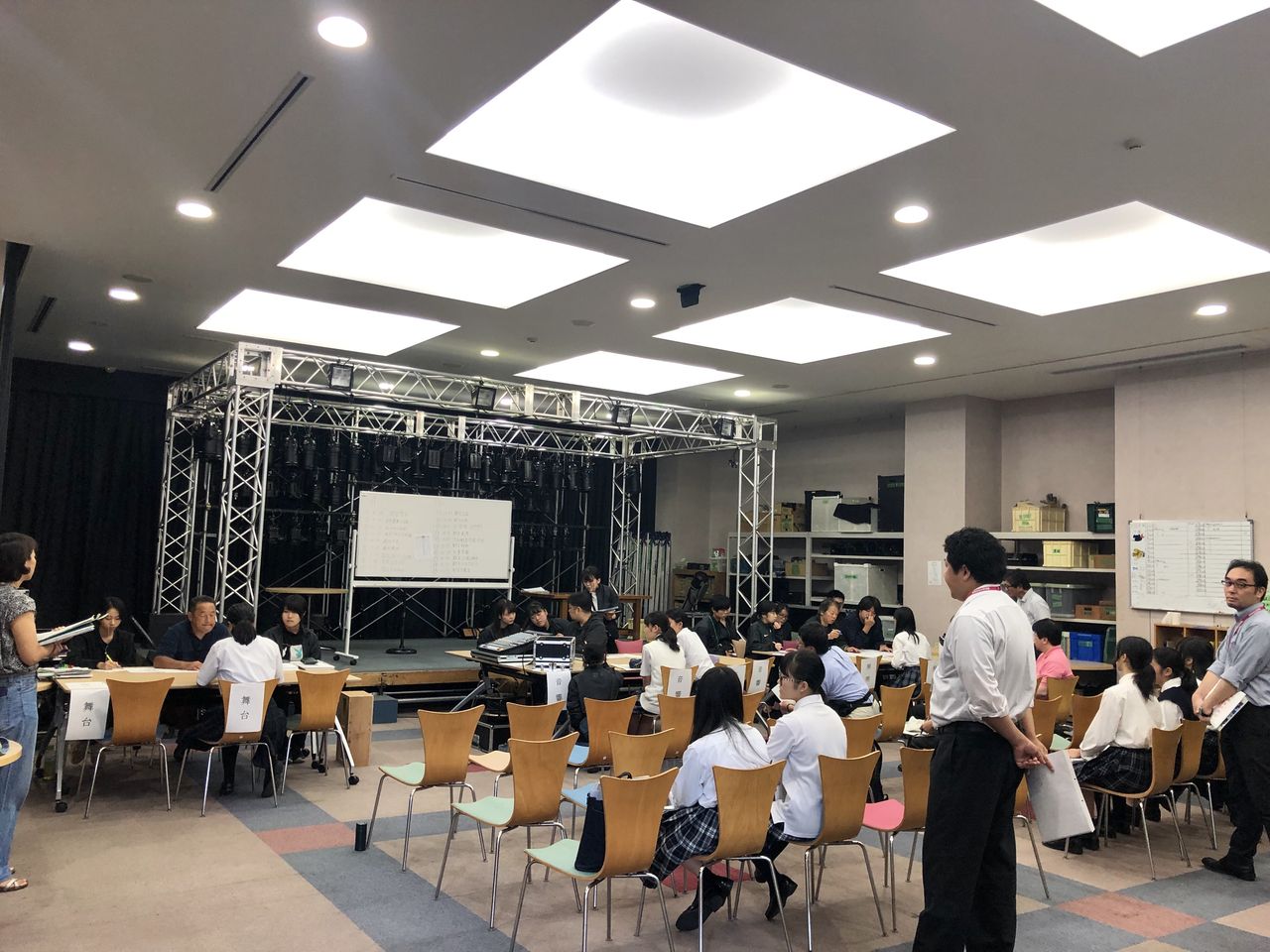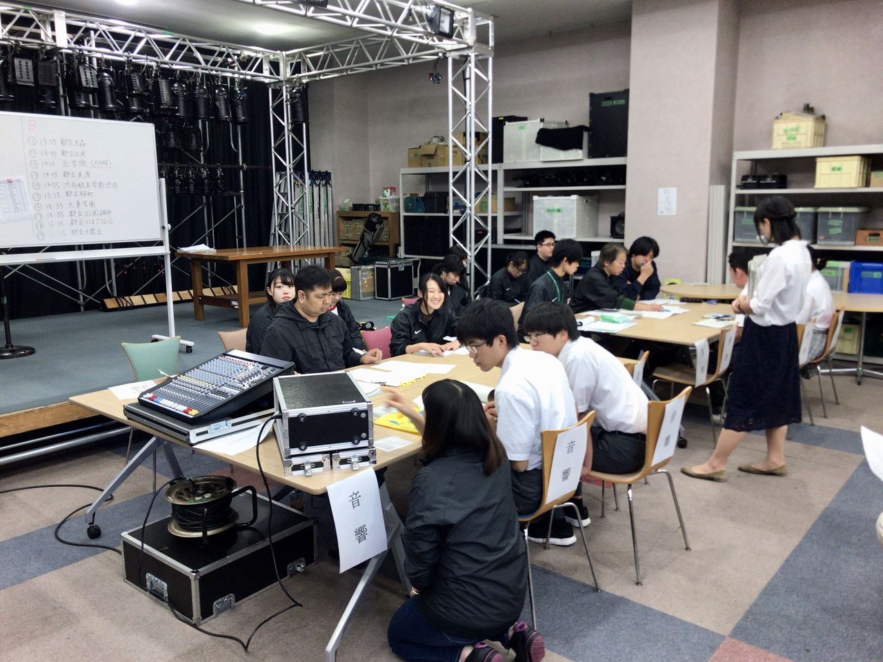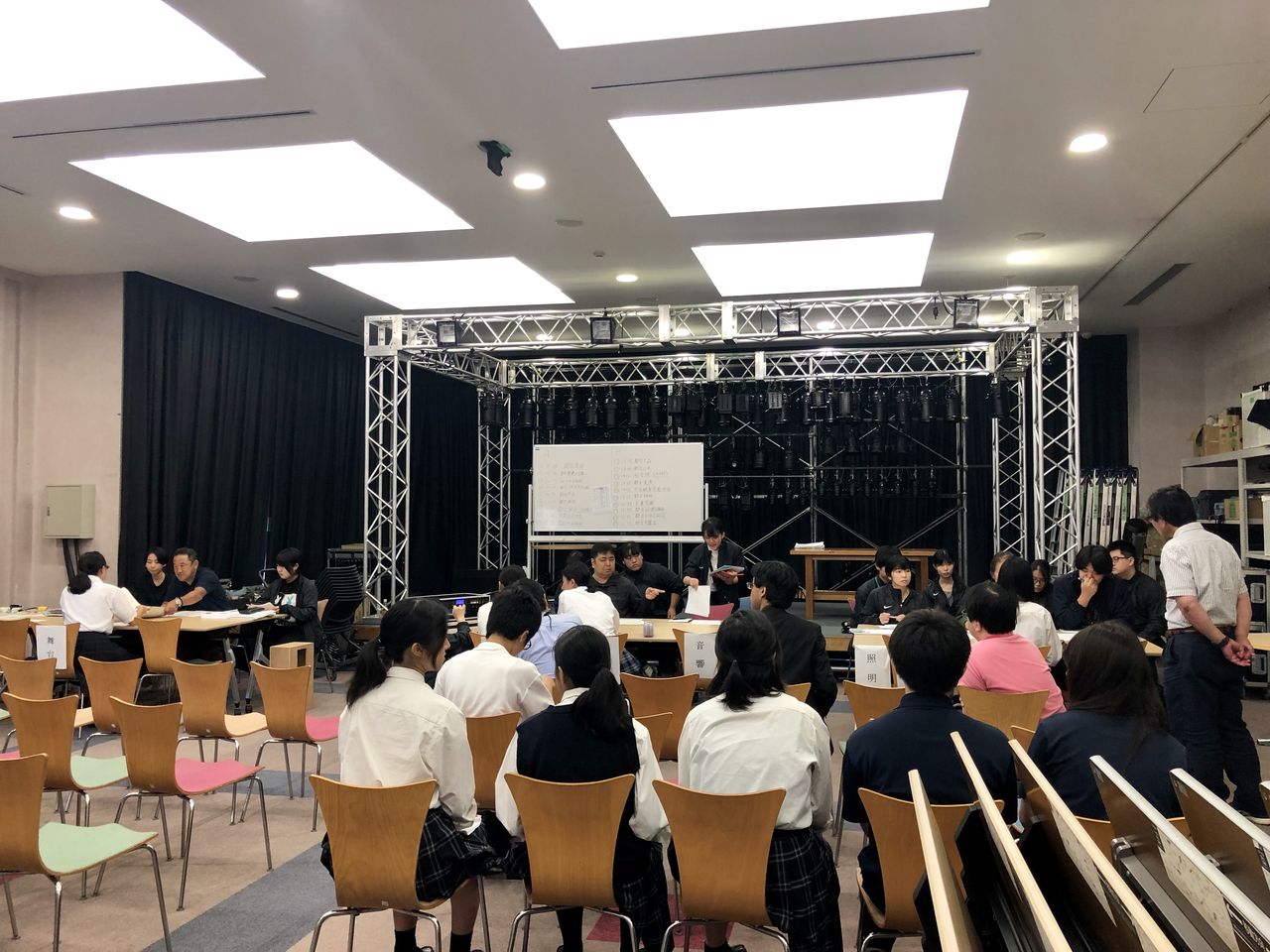 09:30より出場校が照明・音響・舞台に分かれて発表内容の必要機材や仕込み内容について打ち合わせをしました。